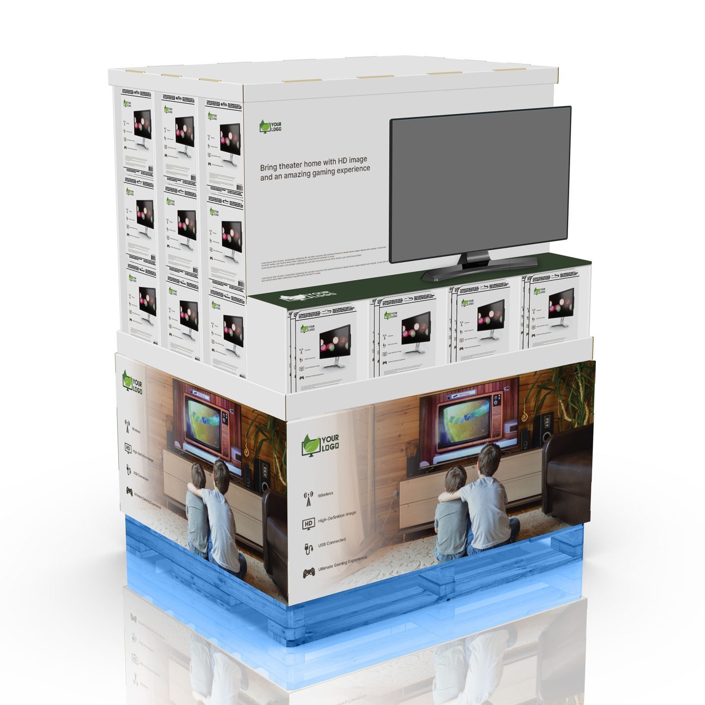 Palette avec télévision pour appareil multimédia, avec en-tête imprimable et crochets/pegs tout autour pour tenir des cartes de bon d’achat. Démo au centre. Pour TV, drone, tablettes, caméra, ordinateur et plus.