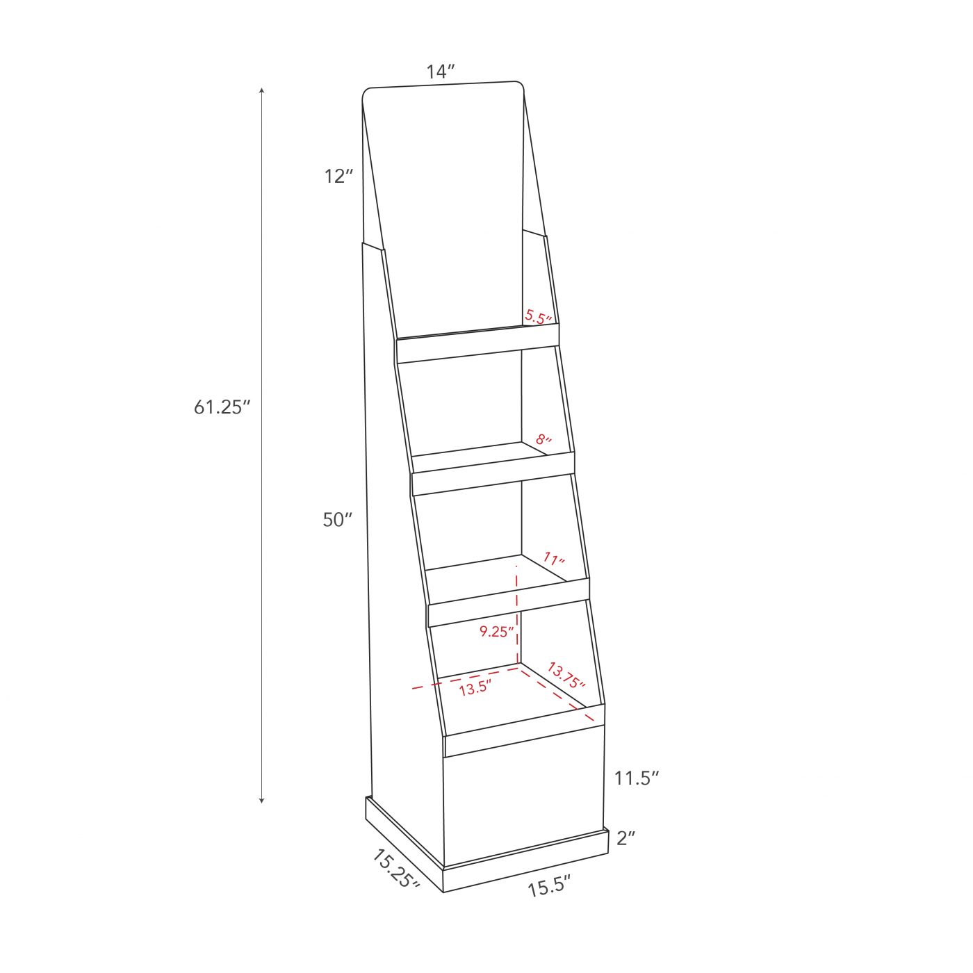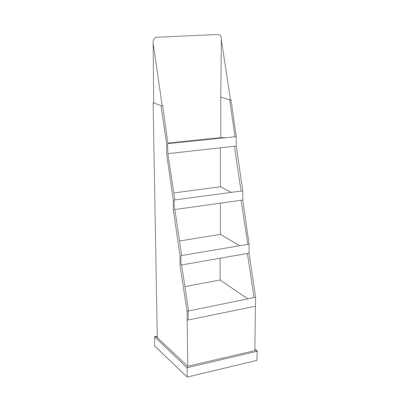 Présentoir de plancher en carton avec 4 tablettes plus petites dans le haut, placé dans un butoir. Pour outils, accessoires, jouets et plus.