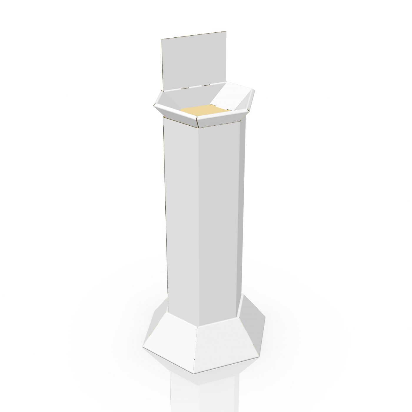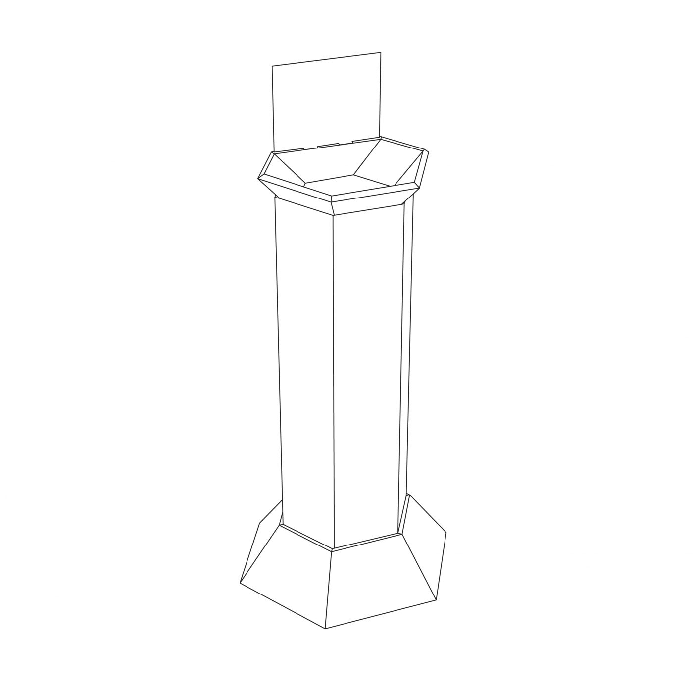 Présentoir de plancher de forme hexagonale avec un panier sur le dessus et en-tête, inséré dans un butoir hexagonal. Le panier peut être utilisé comme présentoir de comptoir. Pour confiseries, petits accessoires ou produits de beauté et plus.