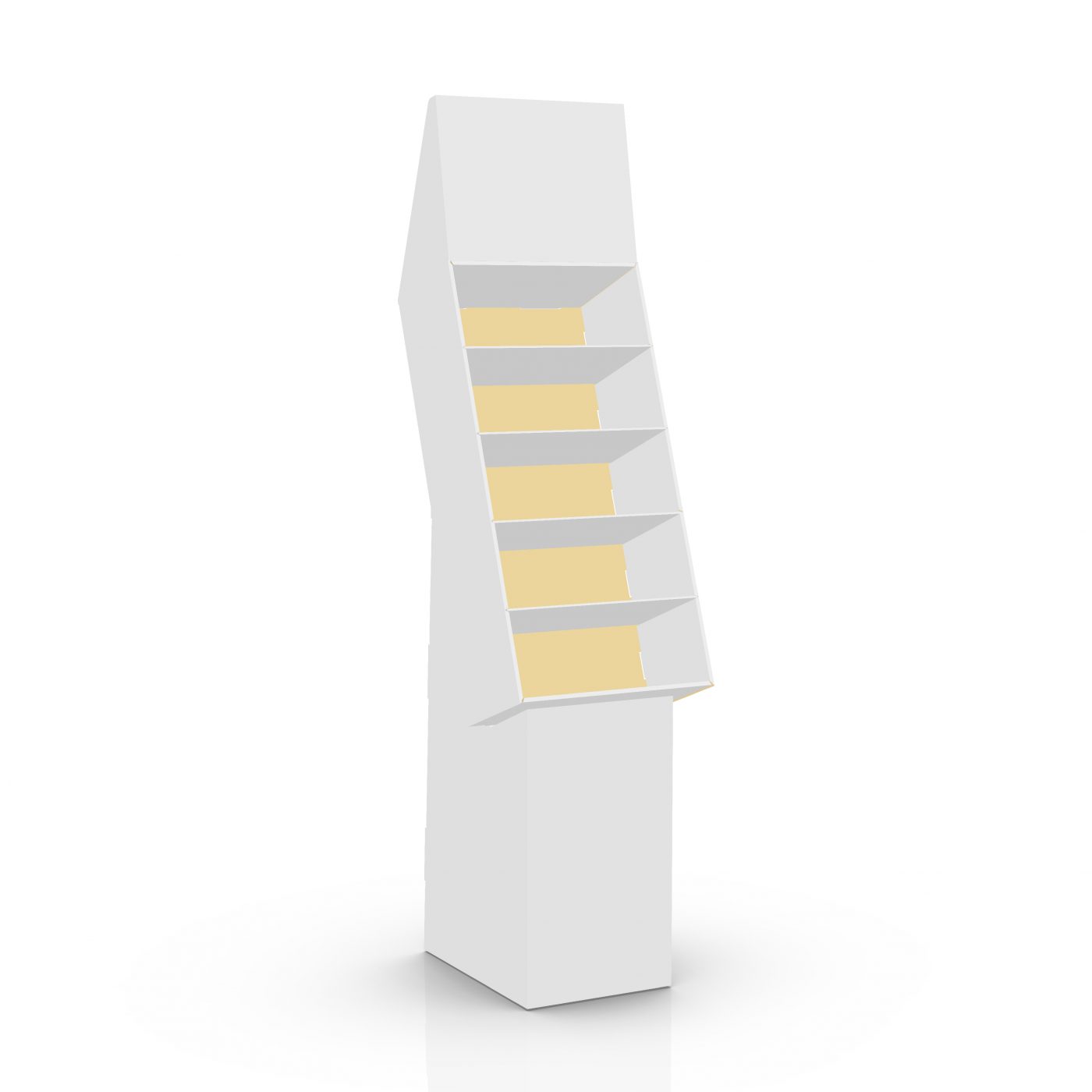 Présentoir de carton en angle avec en-tête et 5 tablettes / 5 étages, déposé sur une base. Pour jouets, accessoires, aliments et plus.