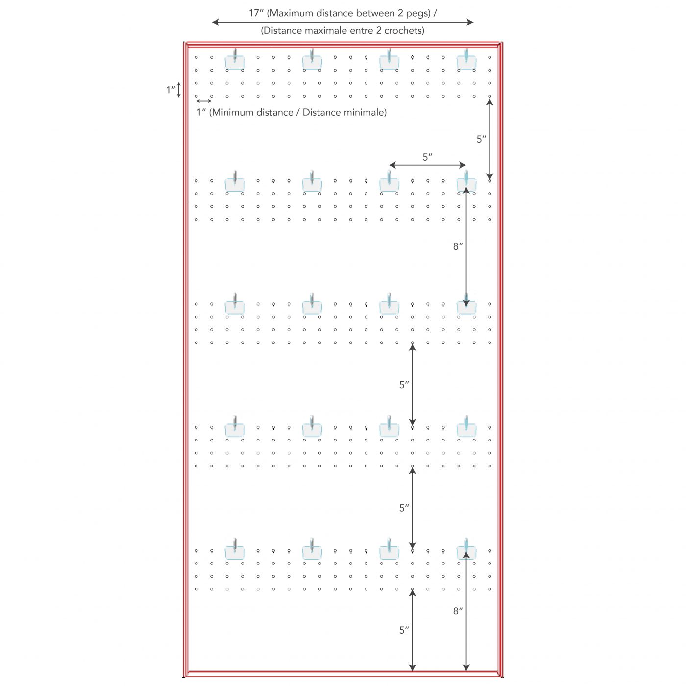 | Crochets/pegs | 6 pouces de long (Voir image pour les différentes positions de crochets) |