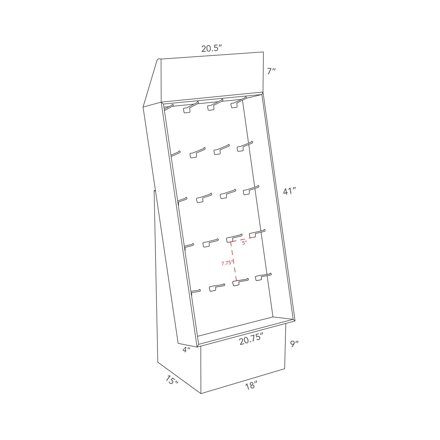 Présentoir de plancher personnalisé en carton à un seul étage avec 20 crochets/pegs sur toute la façade, placé sur une base. Pour porteclés, jouets, sacs, accessoires de téléphone et plus.