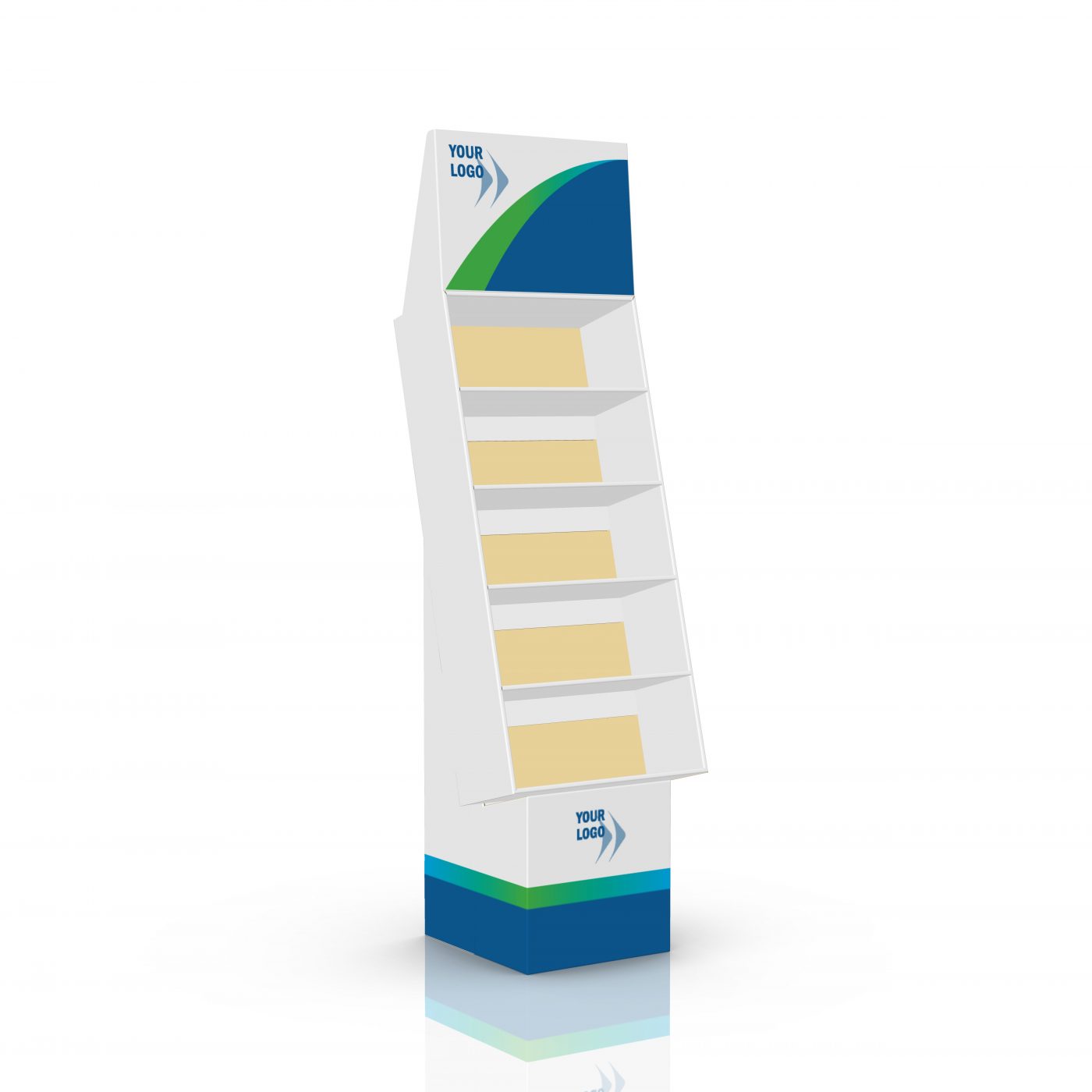 Présentoir de plancher en carton avec en-tête et 5 tablettes, déposé sur une base. Pour produits légers, peluches, jouets, étuis pour cellulaire et plus.