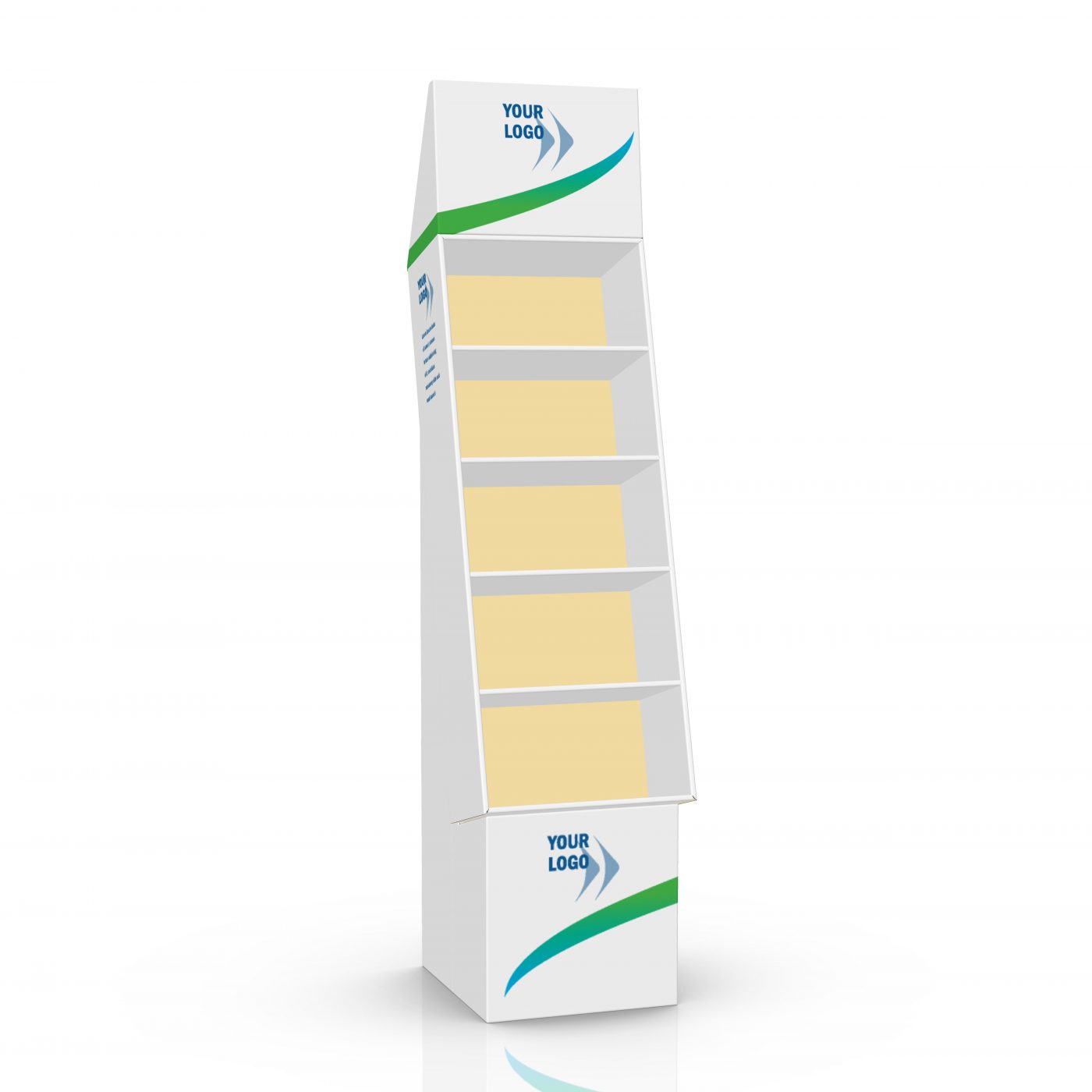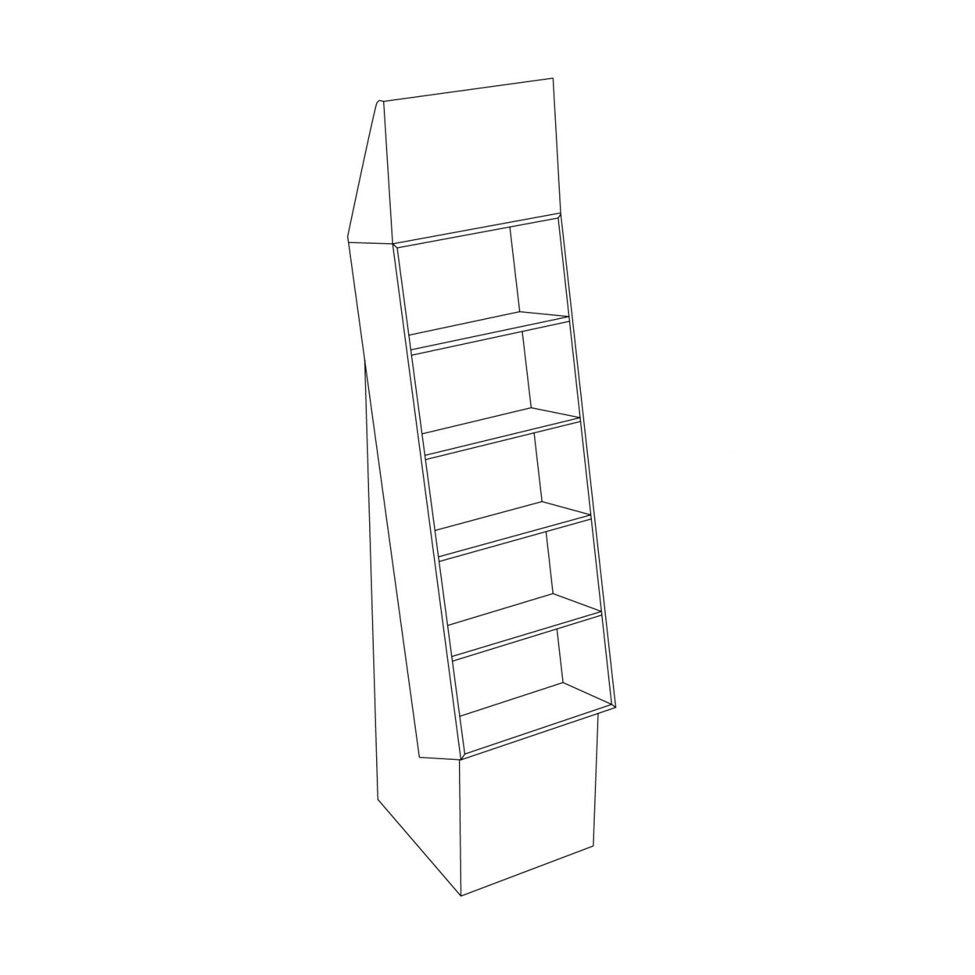 Présentoir de plancher en carton avec en-tête et 5 tablettes, déposé sur une base. Pour jeux, nourriture, accessoires, produits cosmétiques et plus.
