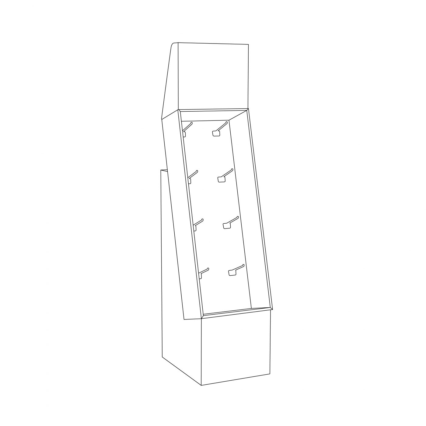 Présentoir de plancher à un seul étage en carton avec 8 crochets/pegs et en-tête, déposé sur une base. Pour accrocher accessoires, nourriture, jouets, étui de cellulaire, portefeuille et plus.