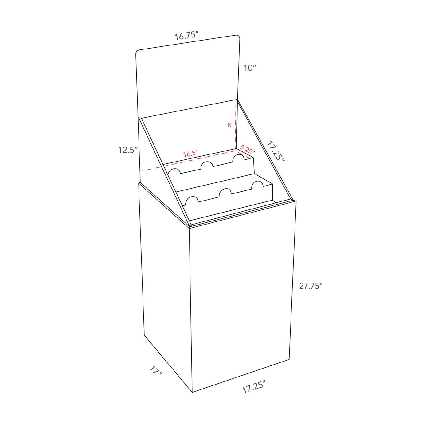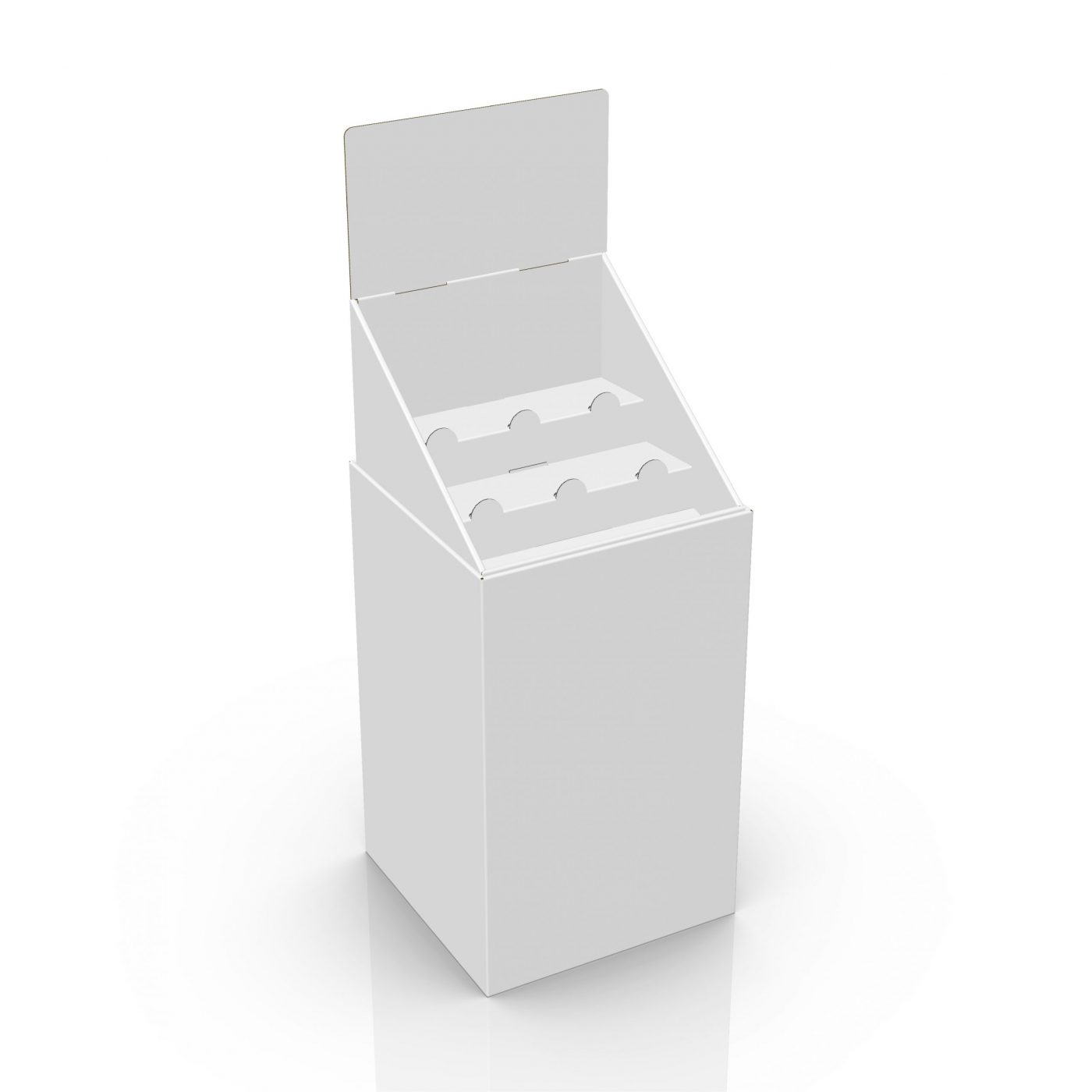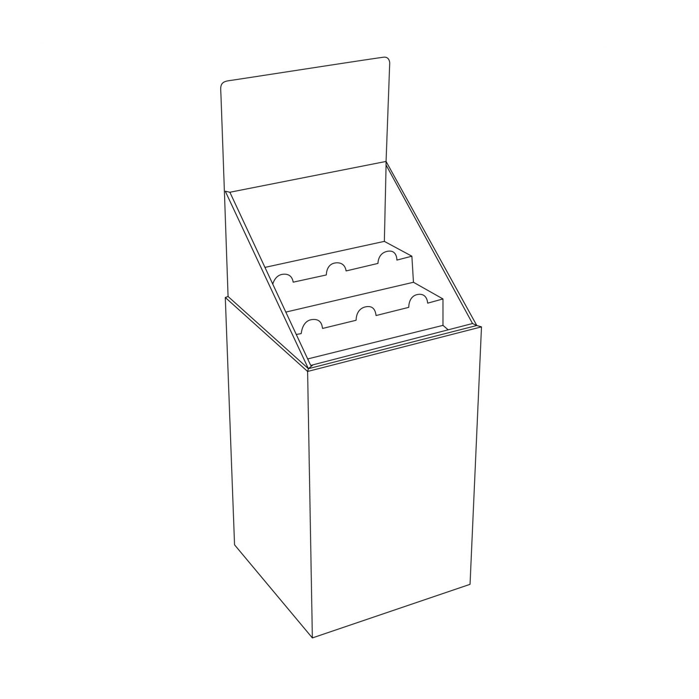 3 tier Cardboard display Dump Bin/dumpbin with tray with shelves and header. For bottles, spices, cosmetics, cards, pamphlets and more.