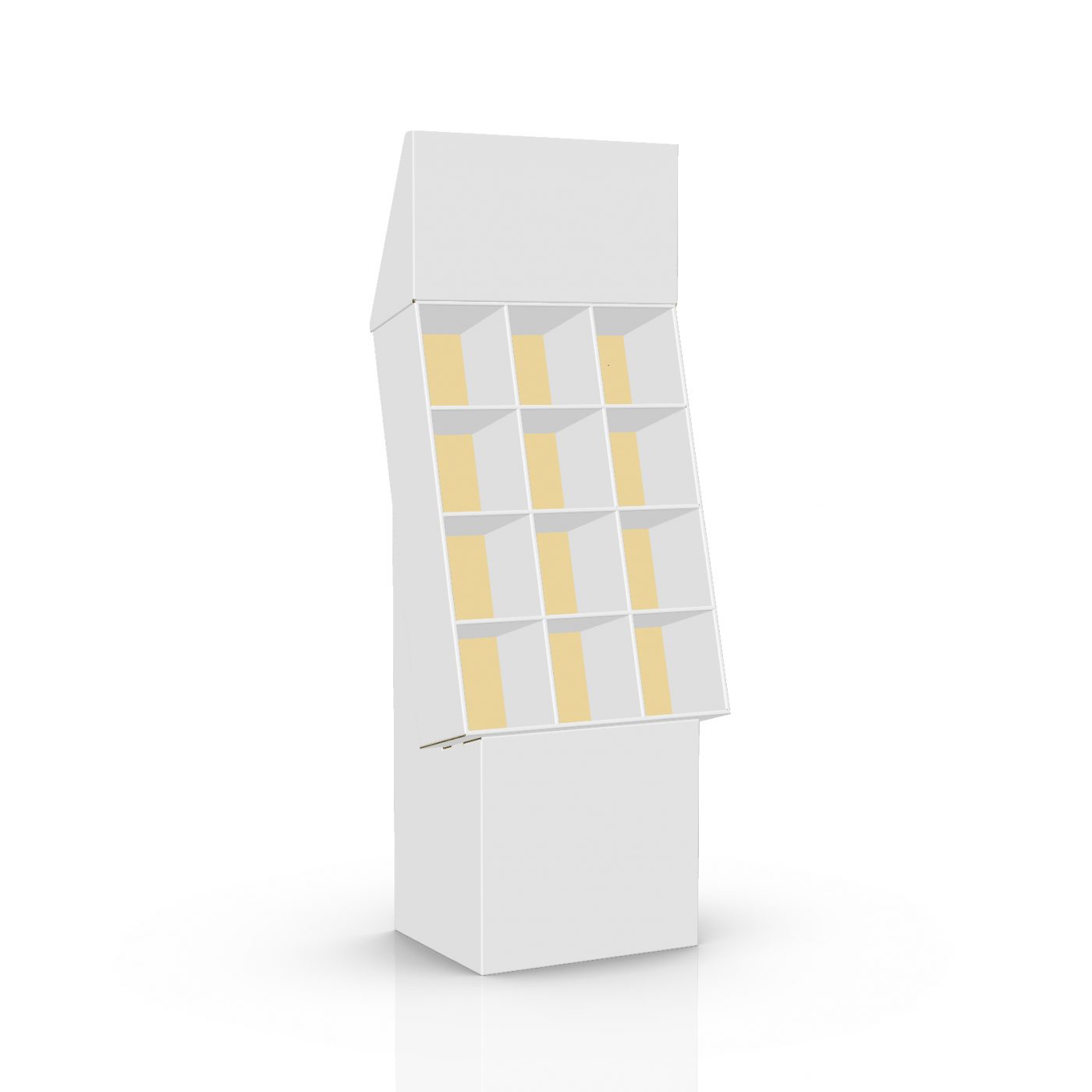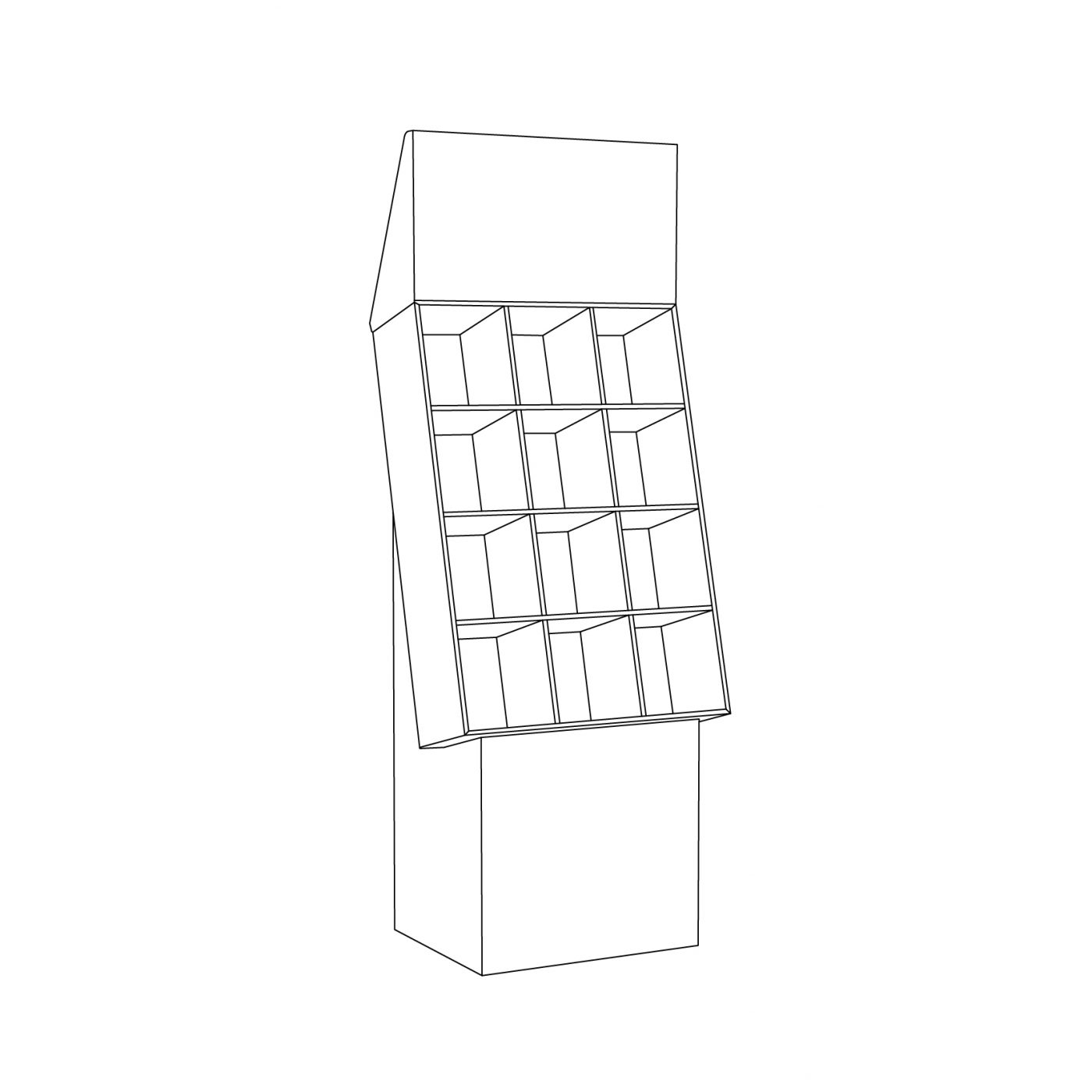 4 tier Angled Cardboard floor display with a header and 4 shelves + separator (12 slots), placed on a base. For small products, phone accessories, toys, deck of cards and more.