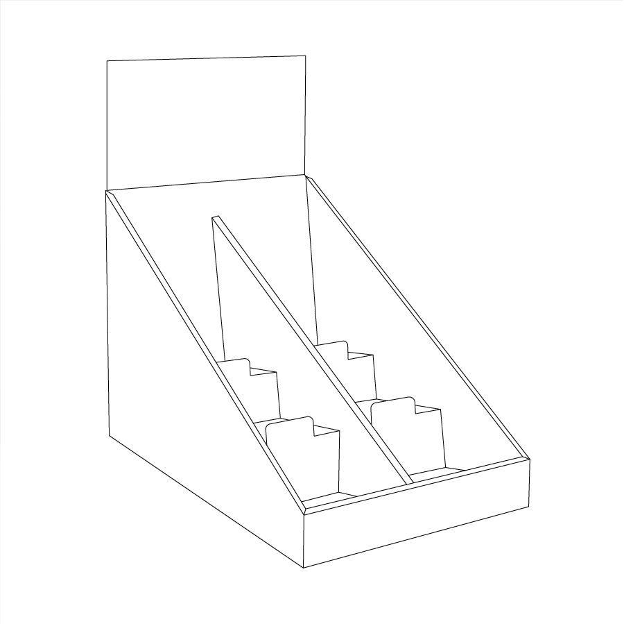 3 tier 100% local Cardboard countertop display with shelves and header + separator in the middle. For retail stores and department stores. Made for phone cases, cards, pills, cosmetics, and more.