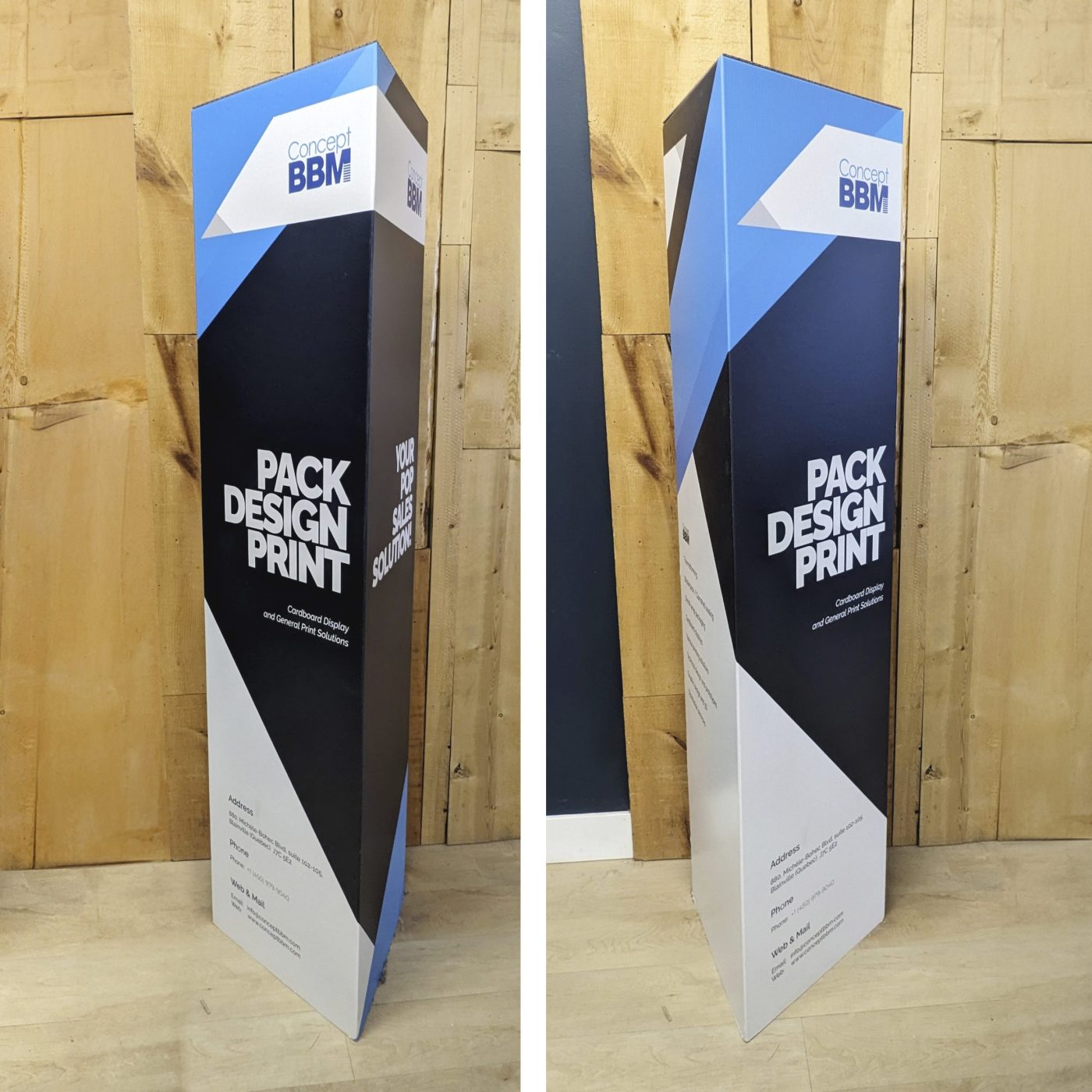 Cardboard standee used to attract attention in a store, trade show, or event. It’s a free-standing vertical display designed to promote your brand, product, or service and increase visibility for customers.