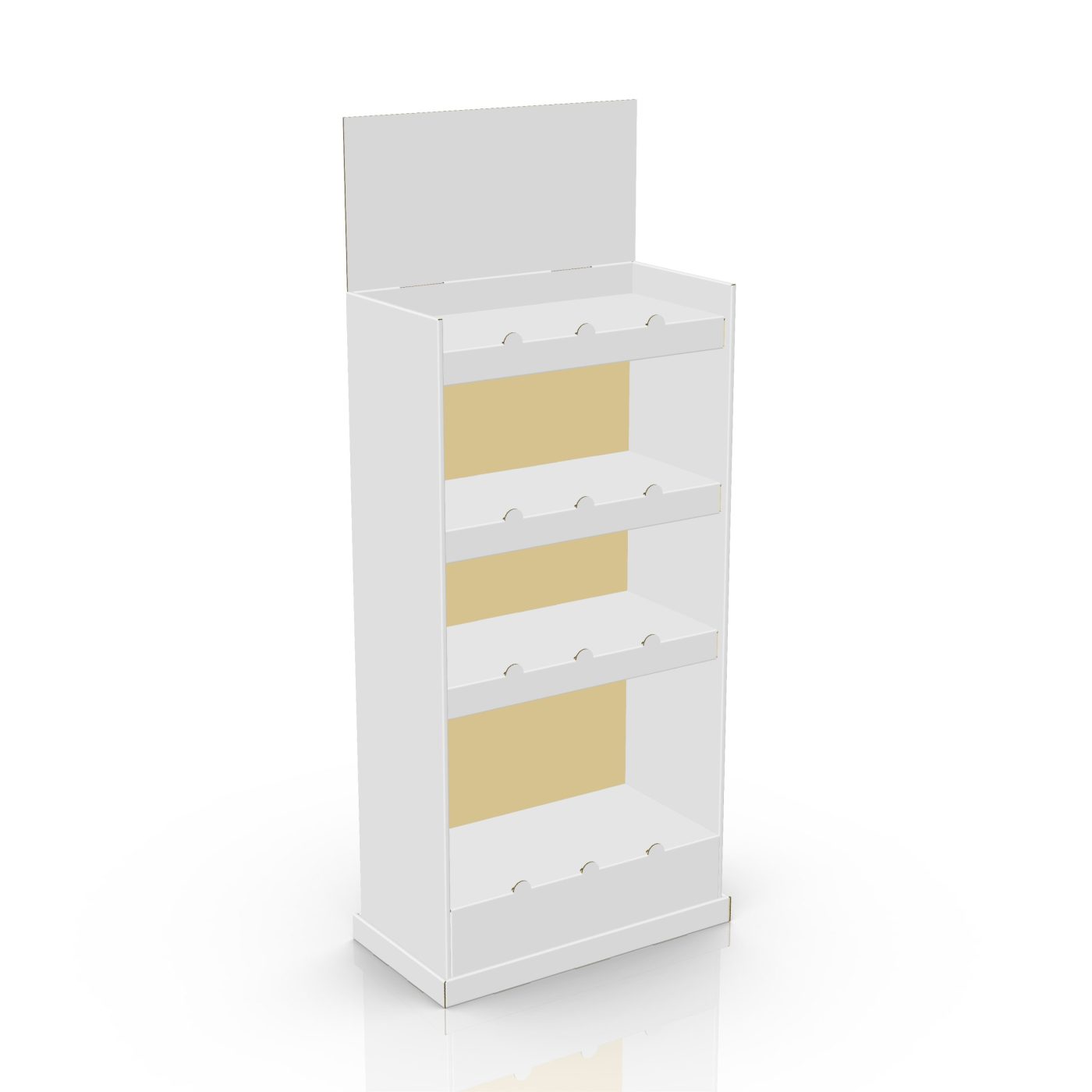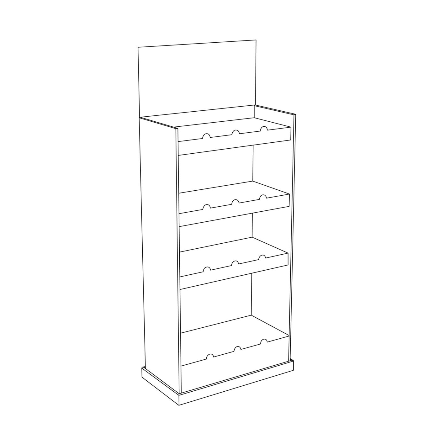 4 tier Cardboard floor display with a header and 4 shelves, placed in a kicker. For snacks, fondue, toys, herbal tea, decorations, and more.