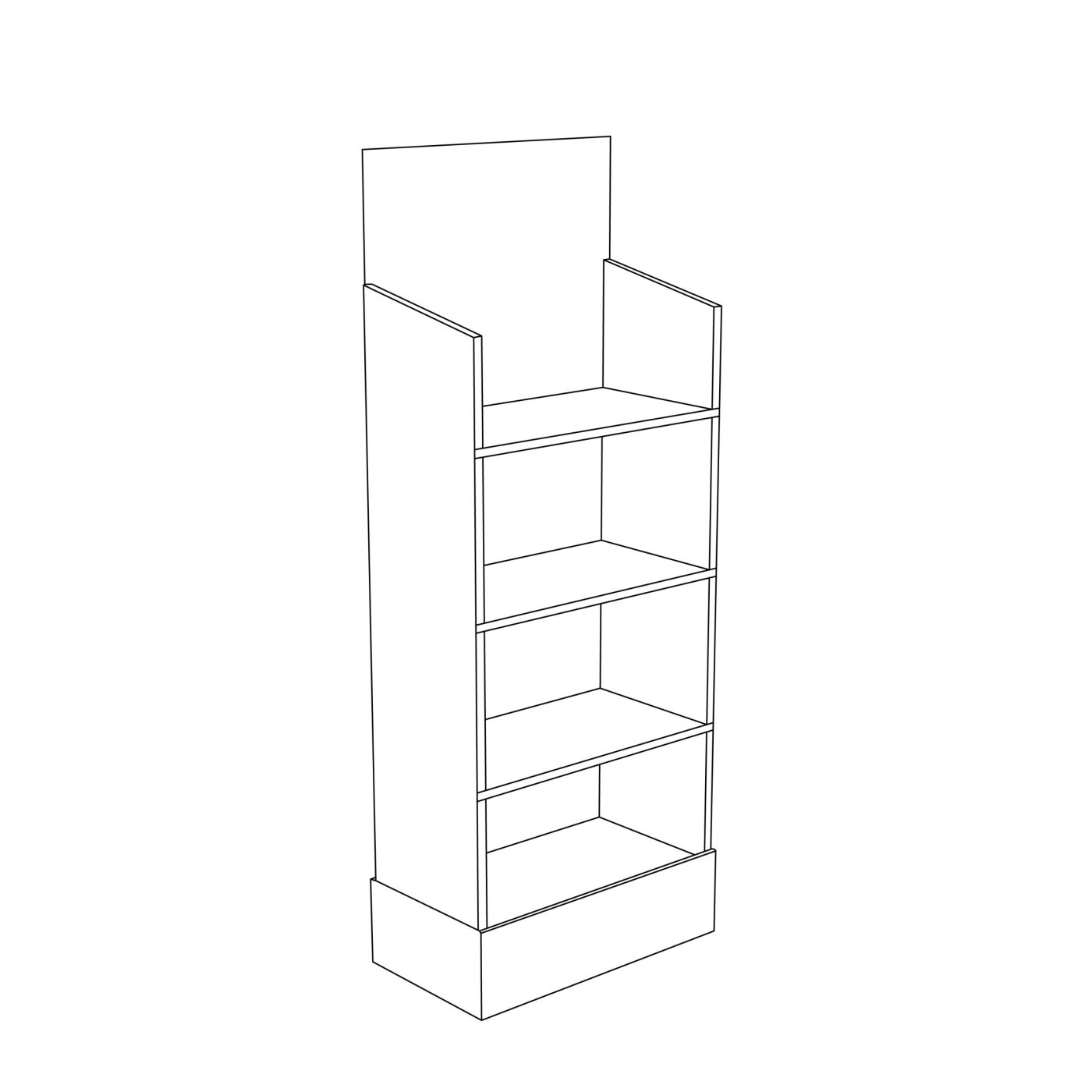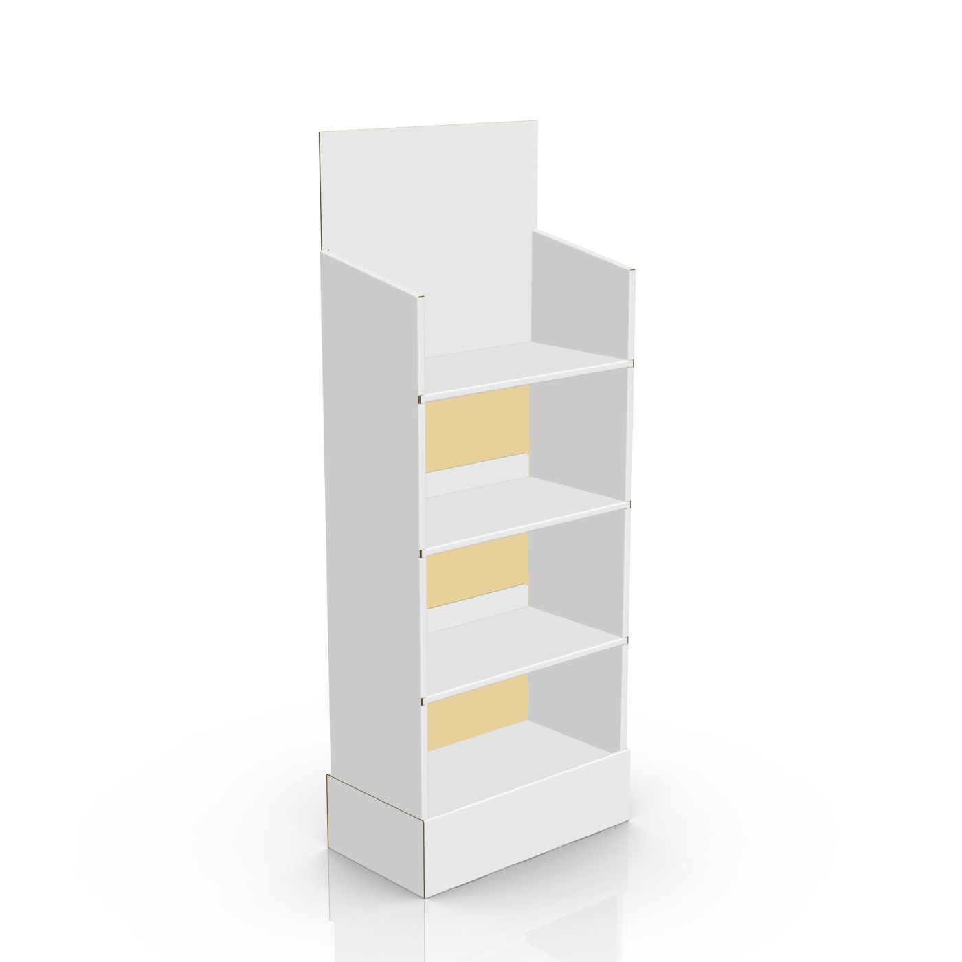 4 tier Cardboard floor display with 4 reinforced shelves, a header and a blocker at the bottom. For heavy objects, toys, games, bread, food and more.