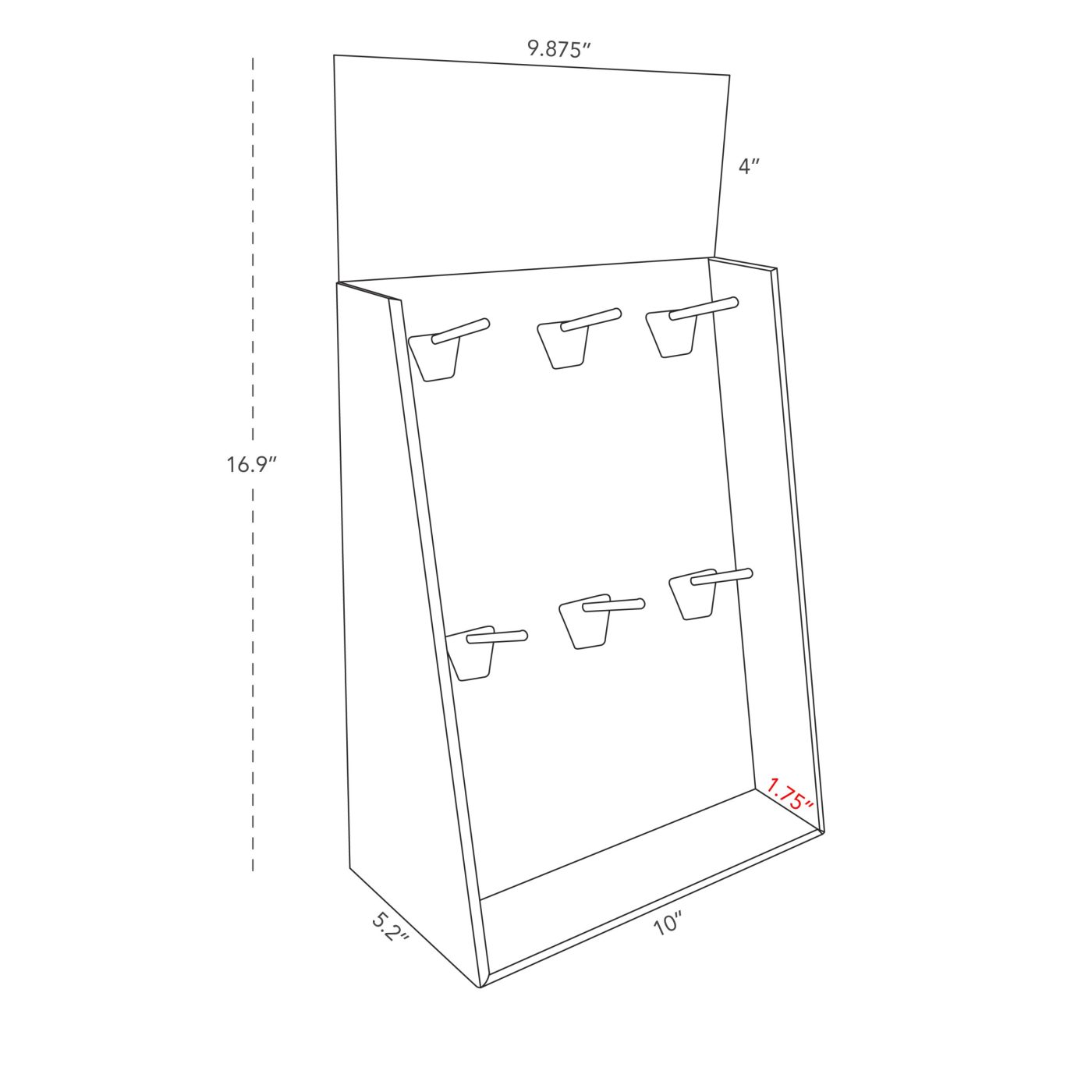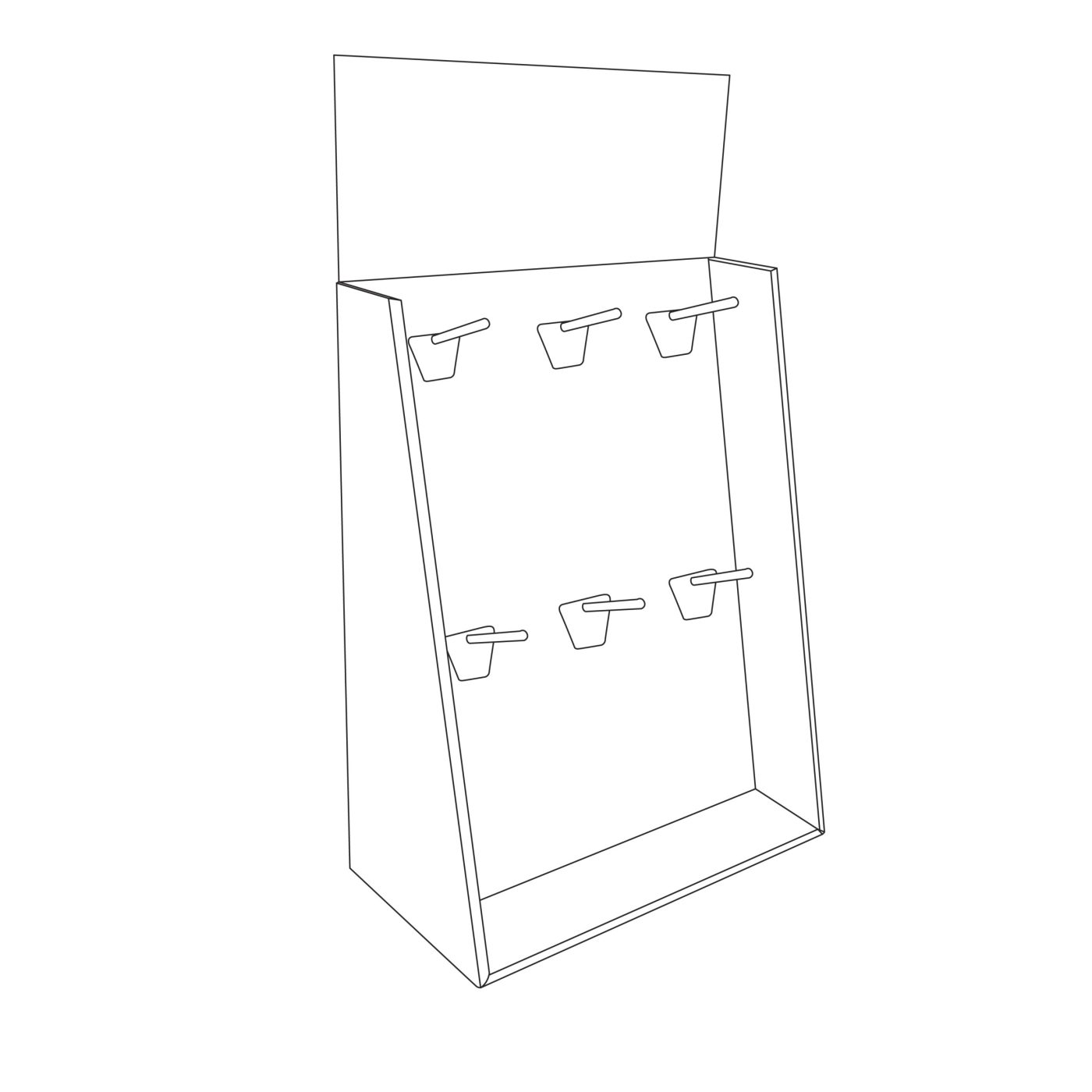 Cardboard slanted counter display with 6 pegs/hooks. For masks, cosmetics, vanilla bottles, phone cases and accessories and more.