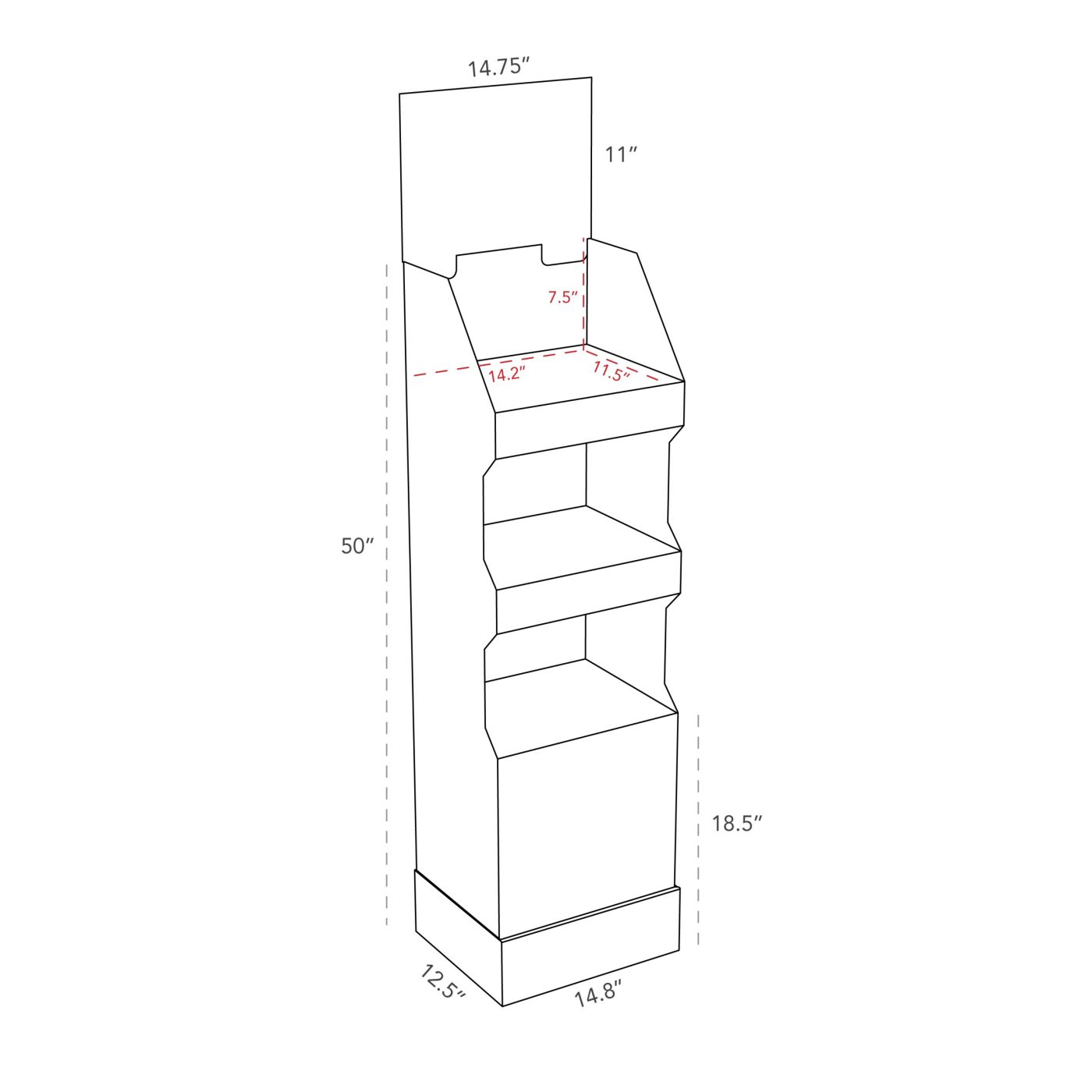 3-tier Cardboard floor Display. Light display with header and 4 shelves. For food, cosmetics, clothes and more.