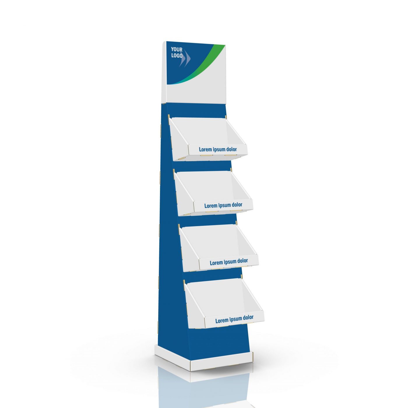 4 tier Cardboard floor display with 4 trays and header. For bottles, spices, cosmetics, pharmaceutical and natural products and light products.