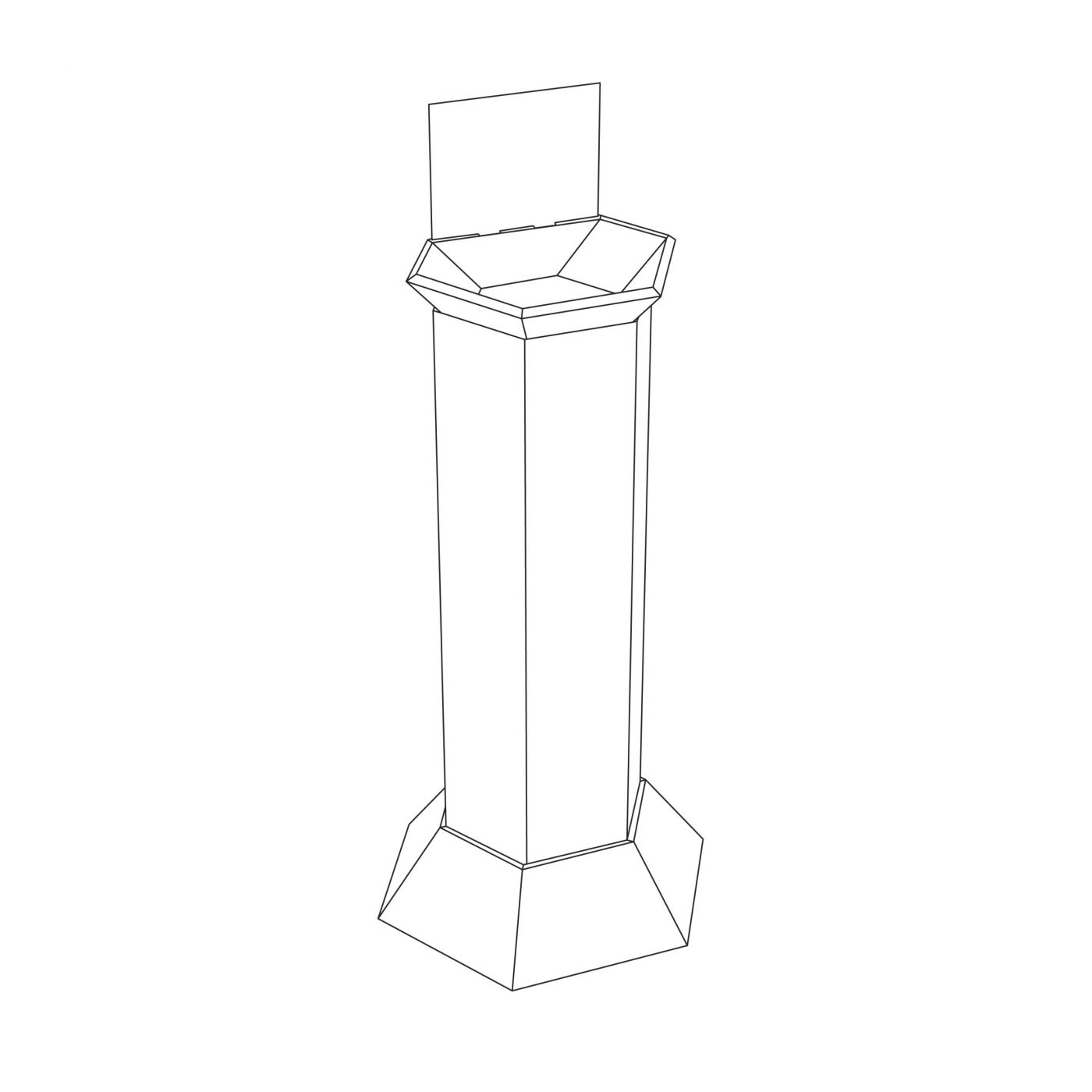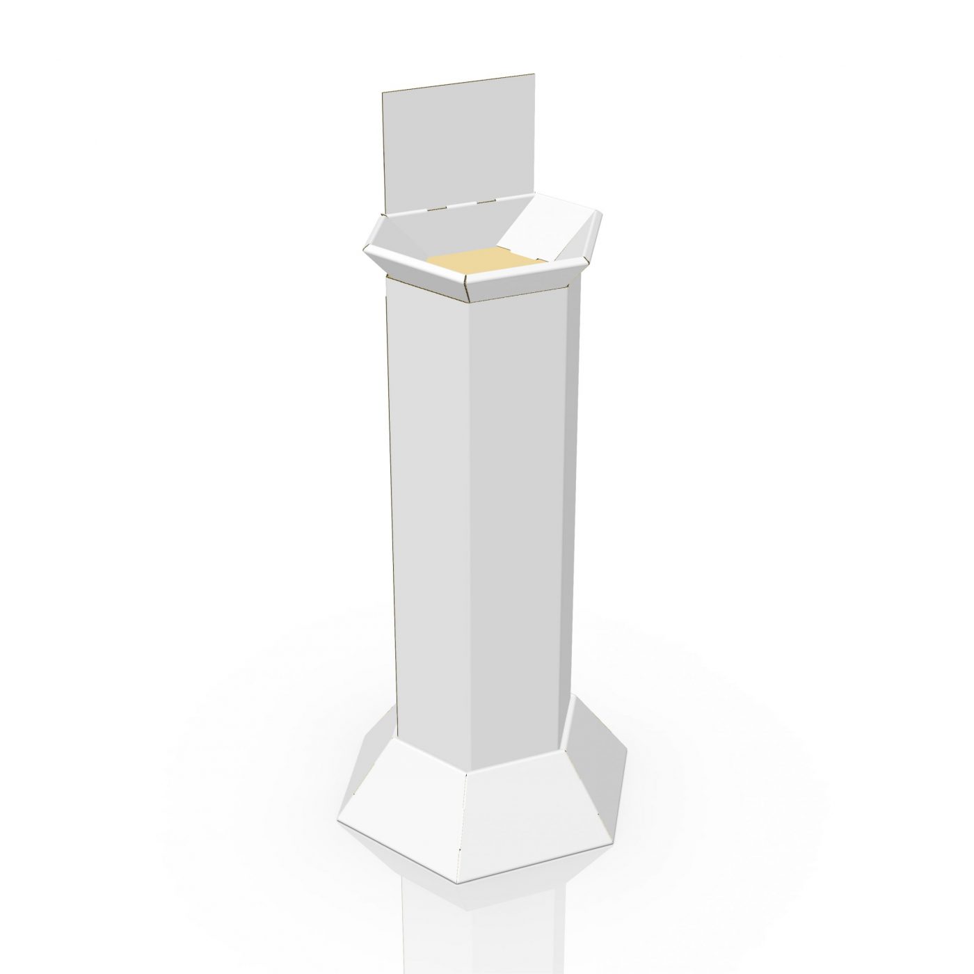 Hexagonal Cardboard floor display with basket, header and kicker. The basket can be used as a counter display. For candies, small accessories or cosmetics and more.