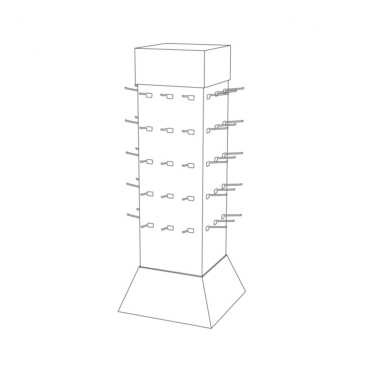 Custom square Cardboard floor display with 60 pegs / 60 hooks all around (15 pegs on each sides). For car toys, bags, accessories and more.