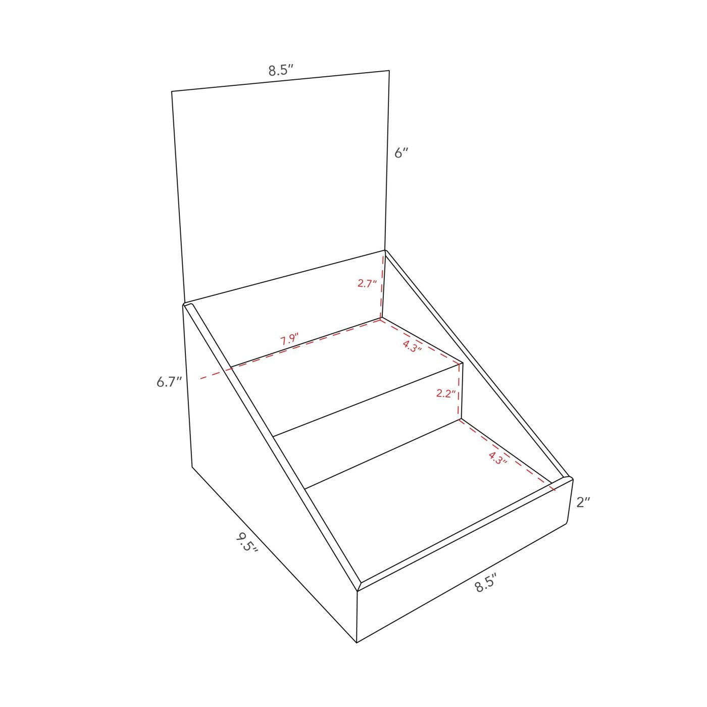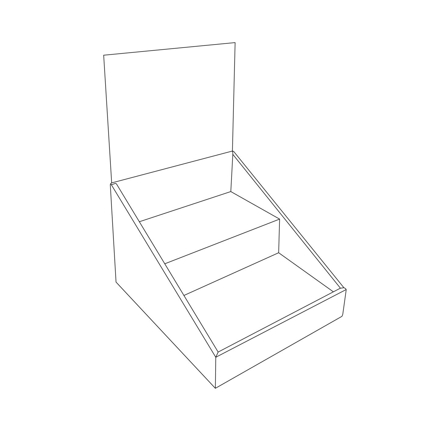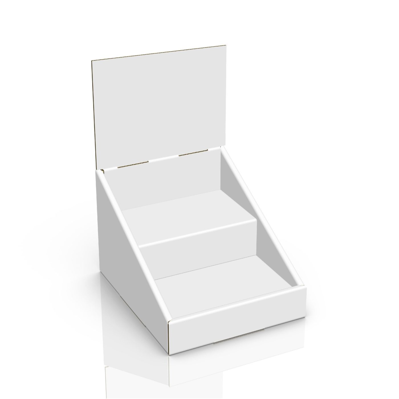 Présentoir de comptoir en carton avec étages et en-tête, pour jeux, cosmétiques, accessoires et plus.