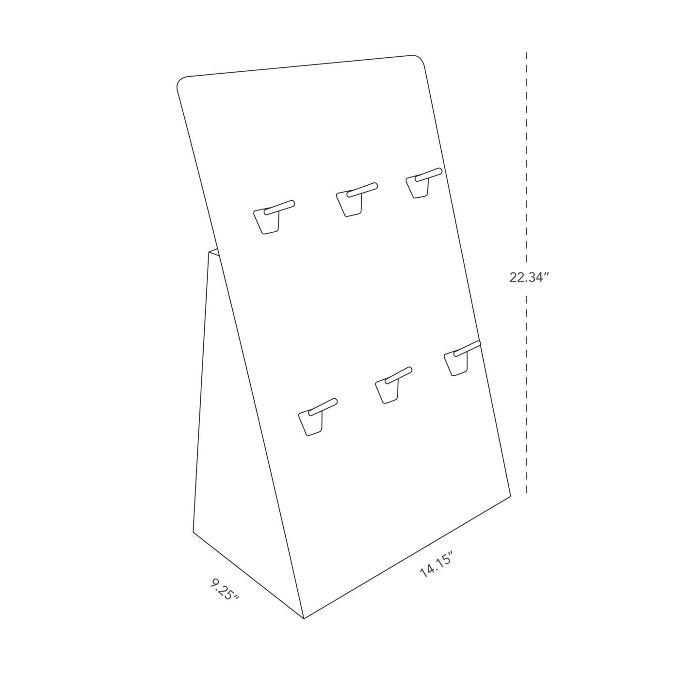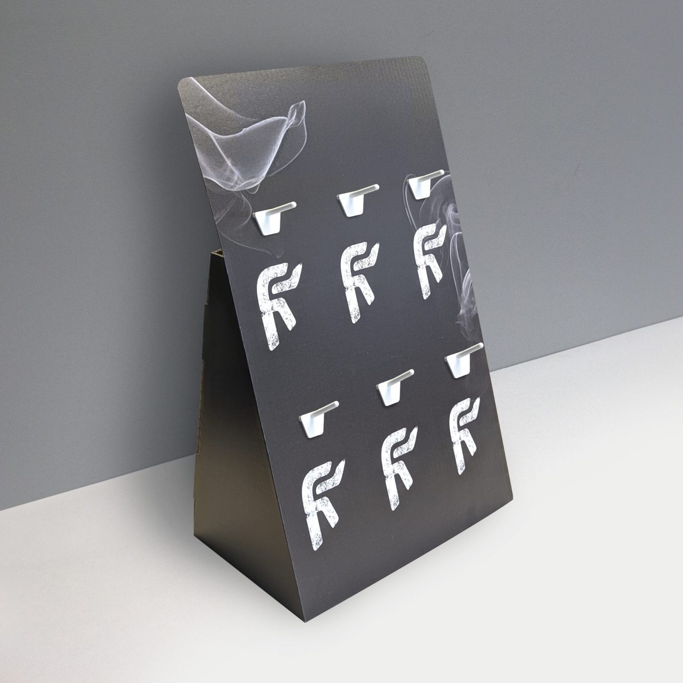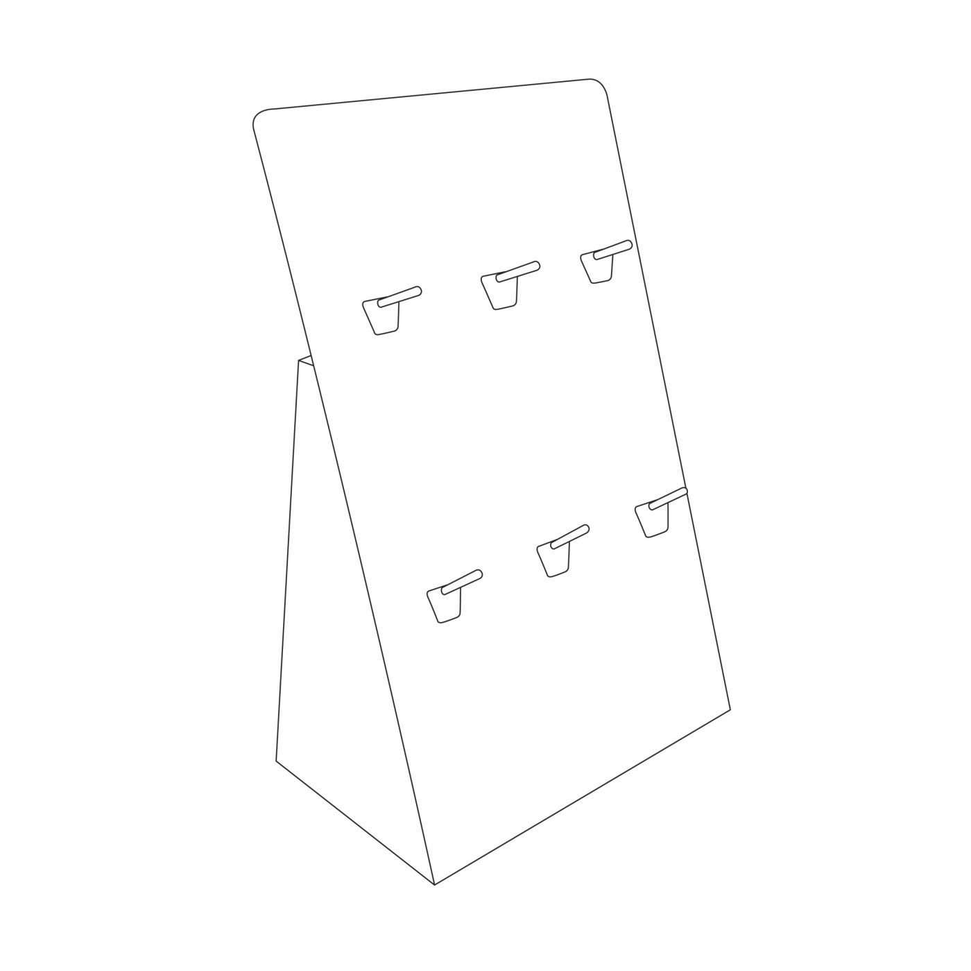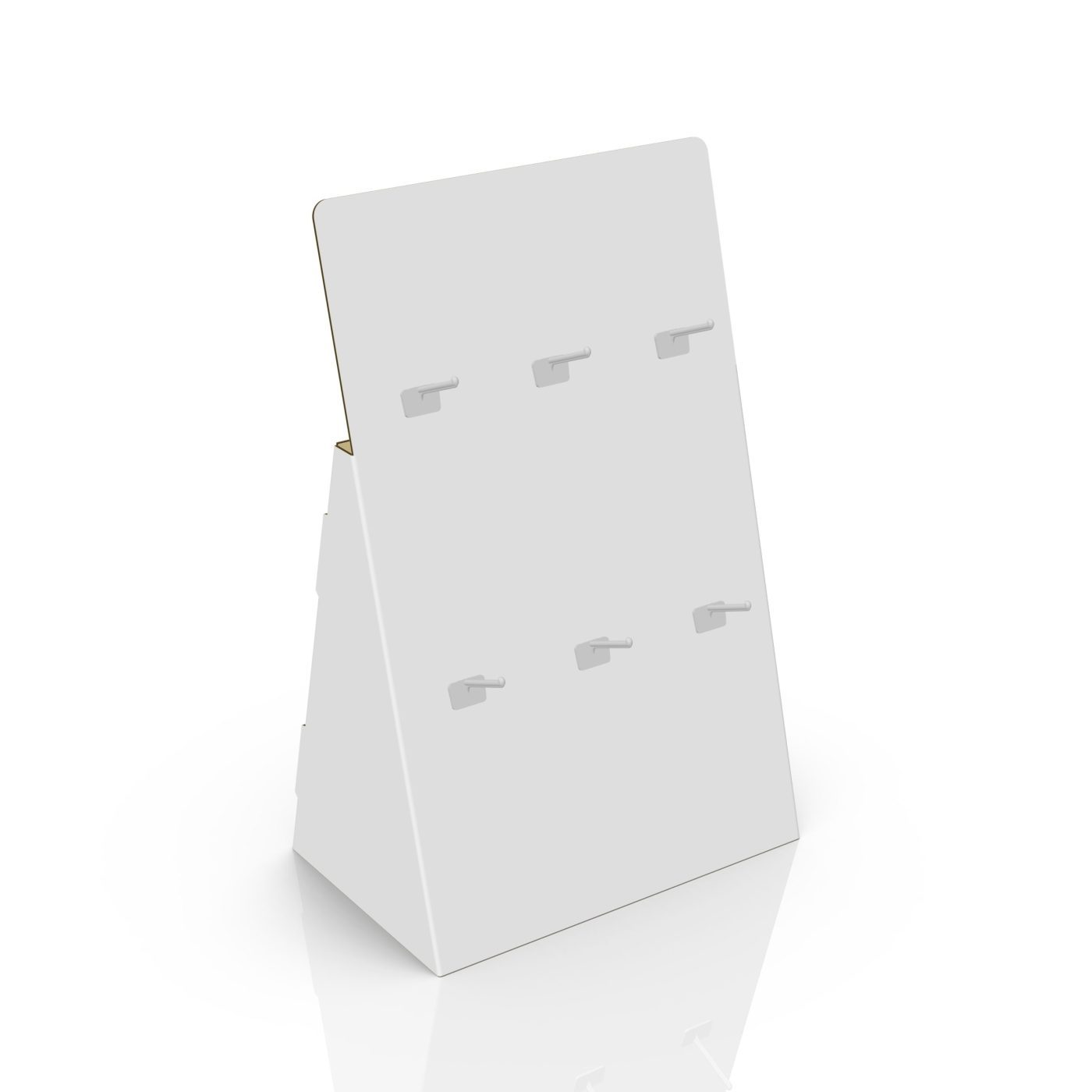 Présentoir de comptoir en carton avec 6 crochets/pegs. Pour masques, produits cosmetiques, bouteilles de vanille, étui à téléphone et plus.