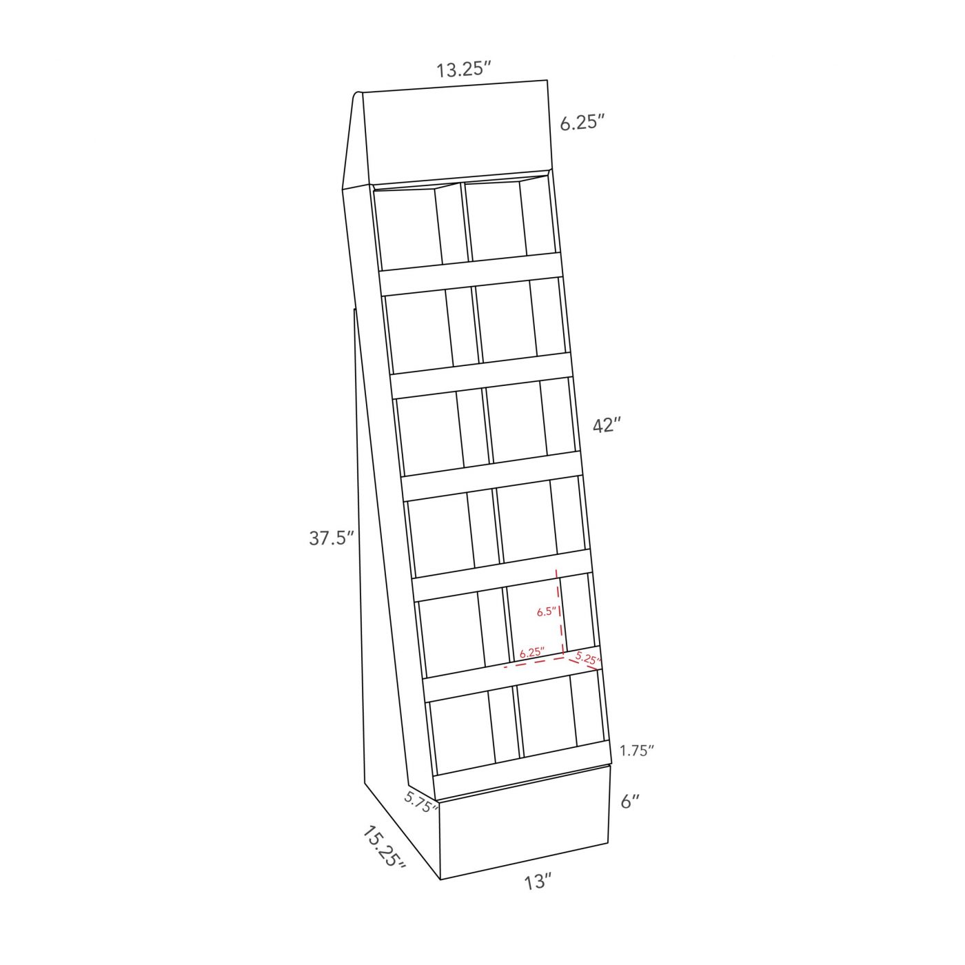 6 tier Angled Cardboard floor display with a header and shelves, placed on a base. For spice bottles, toys, cosmetics and more.