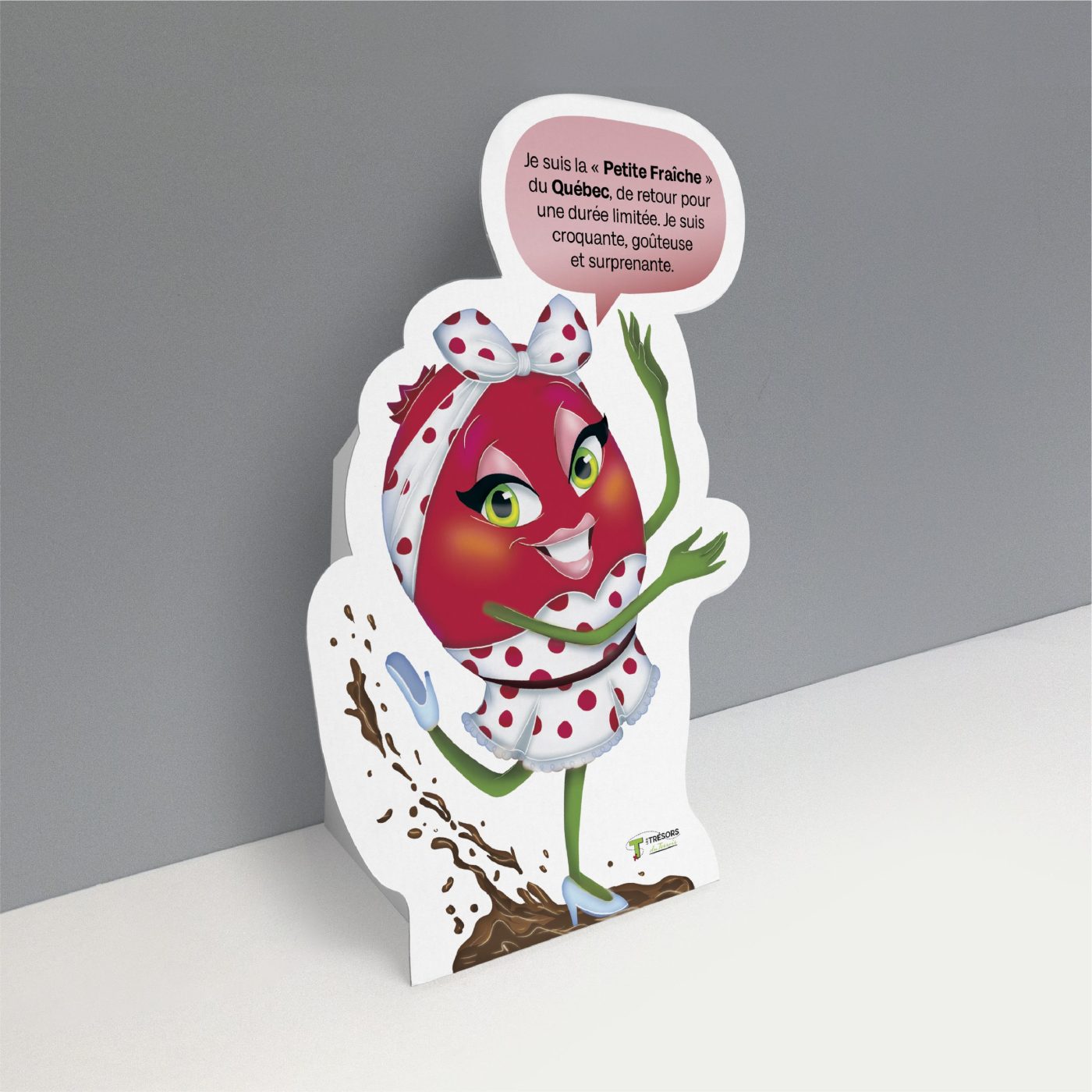 Small Cardboard easel with custom artwork and shape. Made of corrugated cardboard. For publicity and visibility. 100% local. Easy to assemble.
