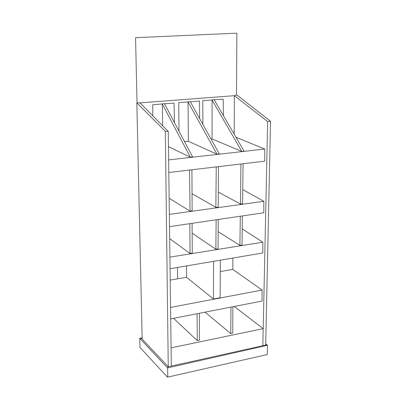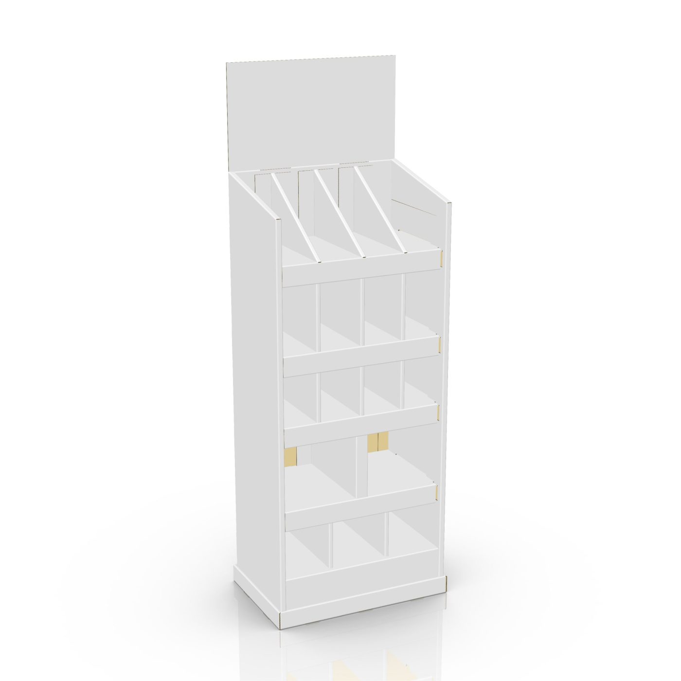 5-tier Cardboard floor display with a header and 5 shelves, placed in a kicker. For snacks, fondue, toys, decorations, sauces and more.