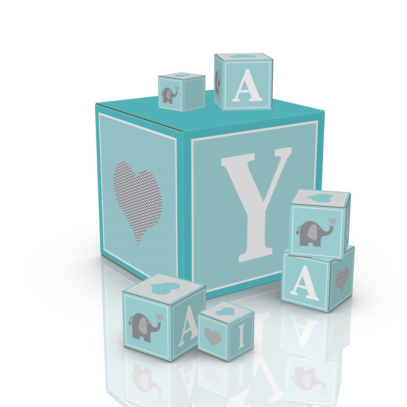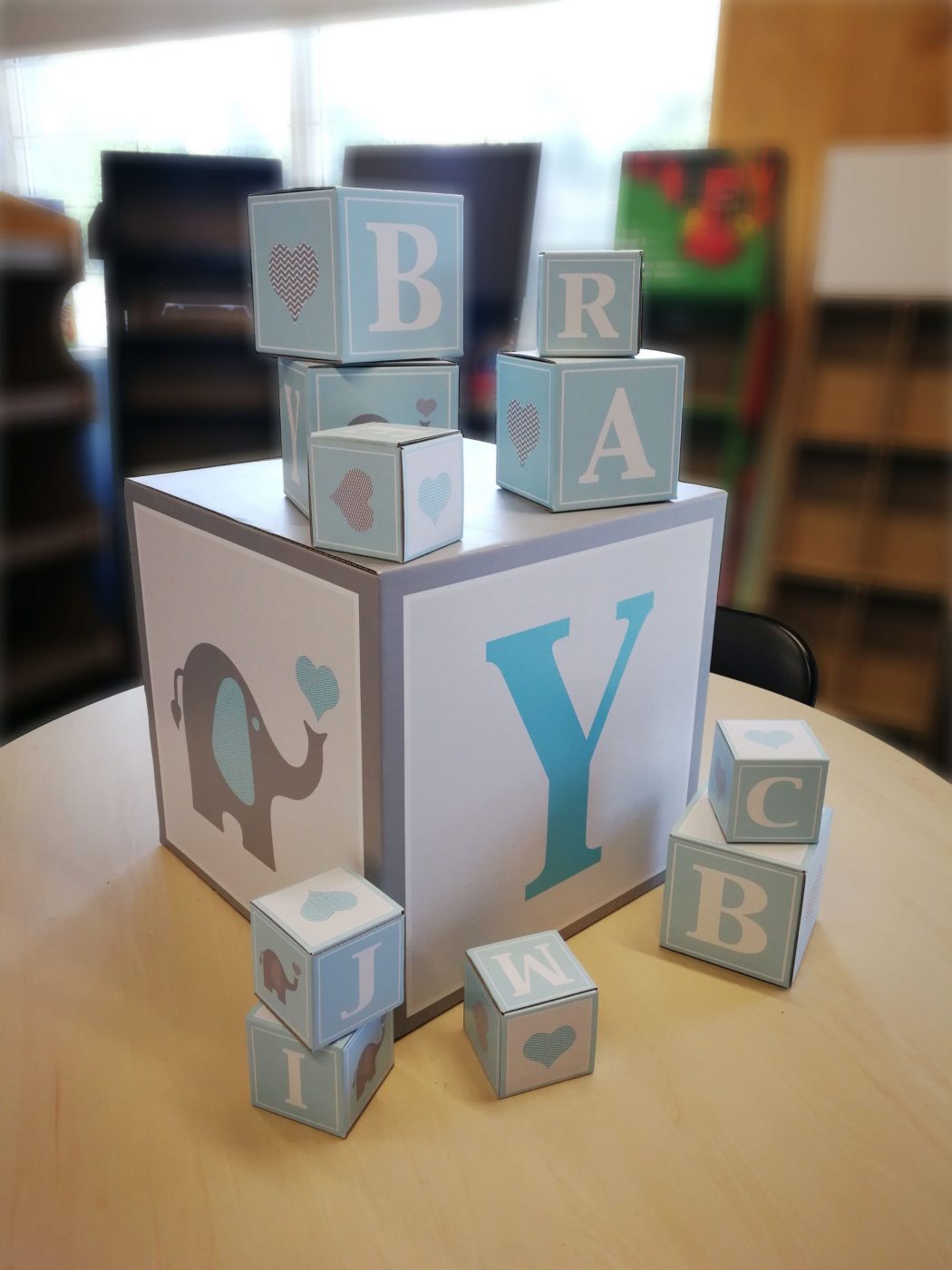 Custom Cardboard printed cubes. Custom artwork and size. For a baby shower or other occasions.