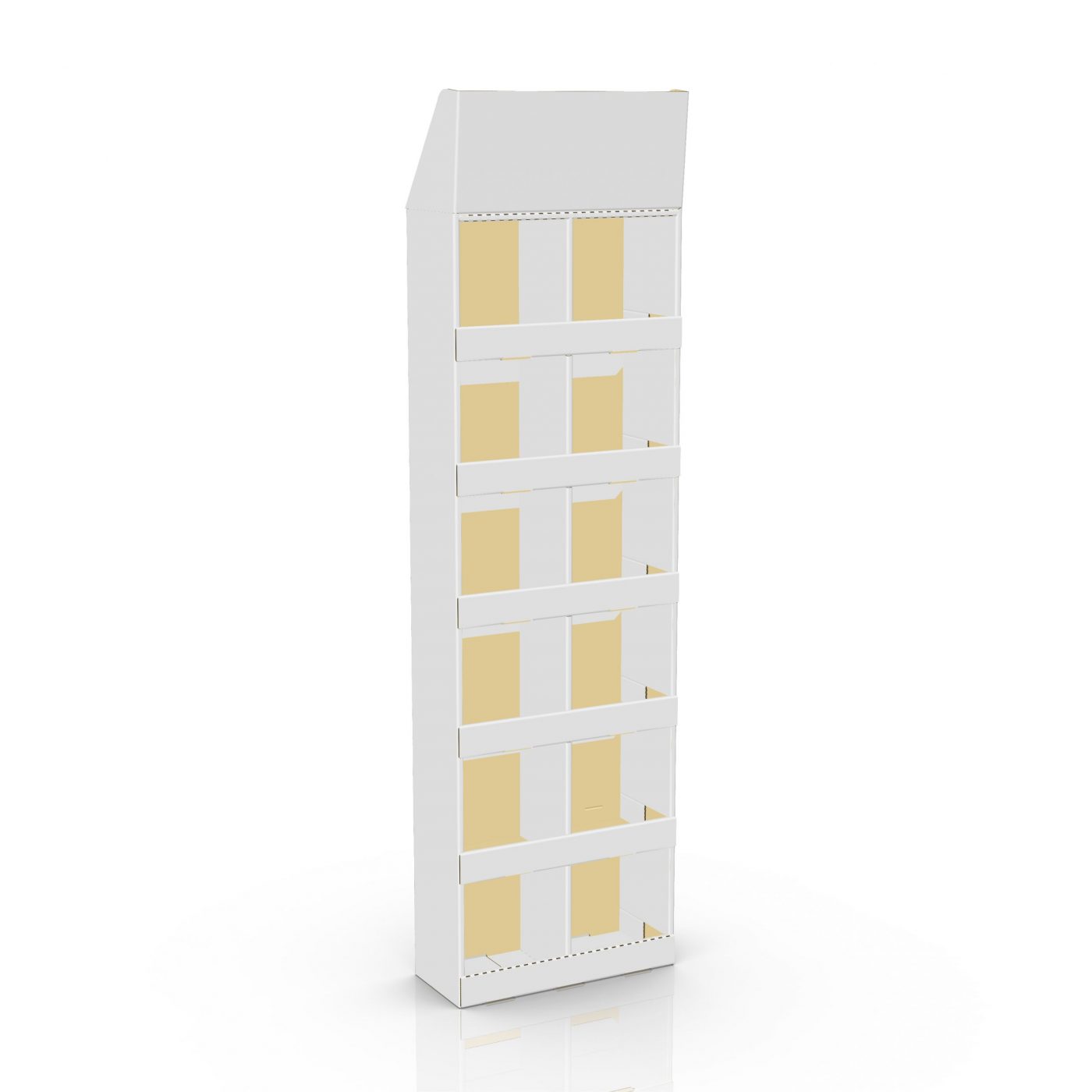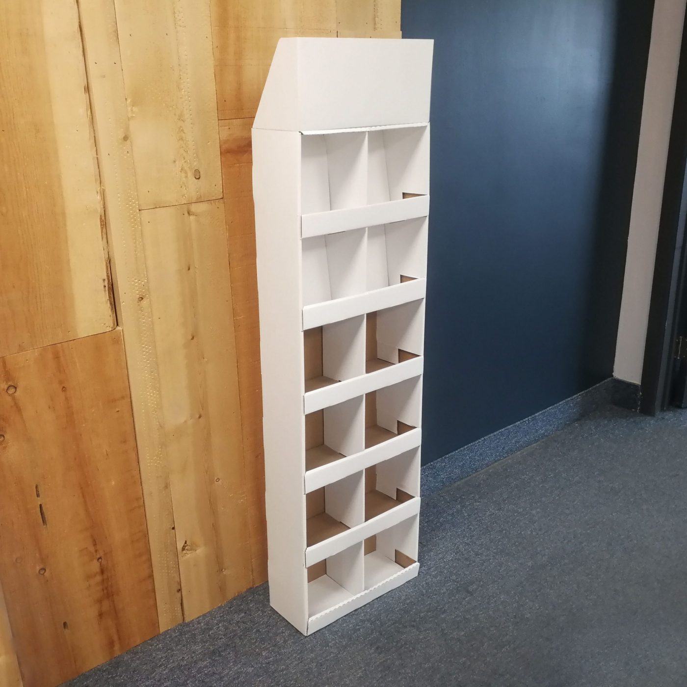 Cardboard Sidekick with shelves and an optional header. Designed to be wall mounted. For accessories, spices, cosmetics, games and more.