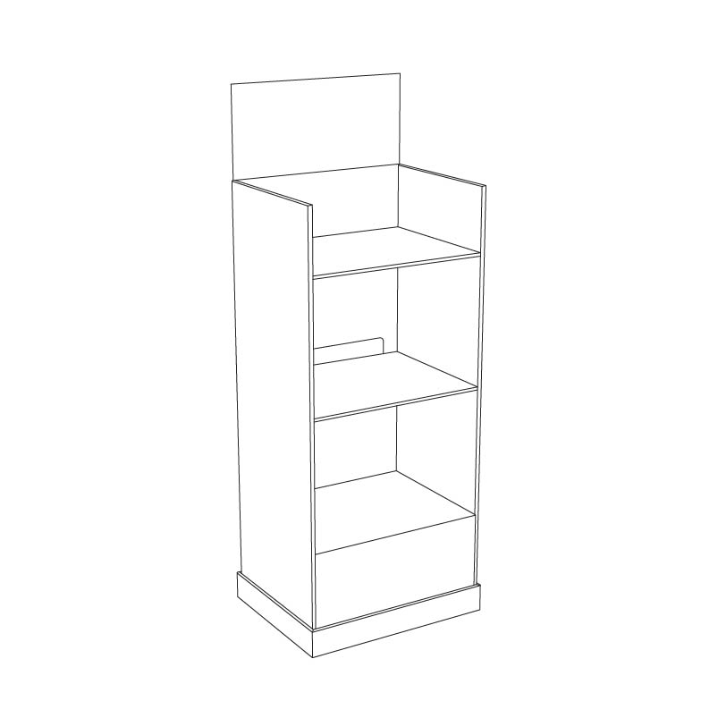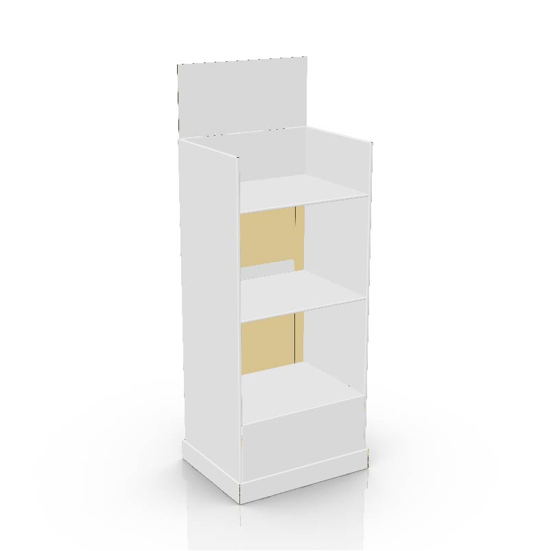 3 tier Cardboard floor display with a header and 3 shelves, placed in a kicker. For clothing, light products, toys and more.