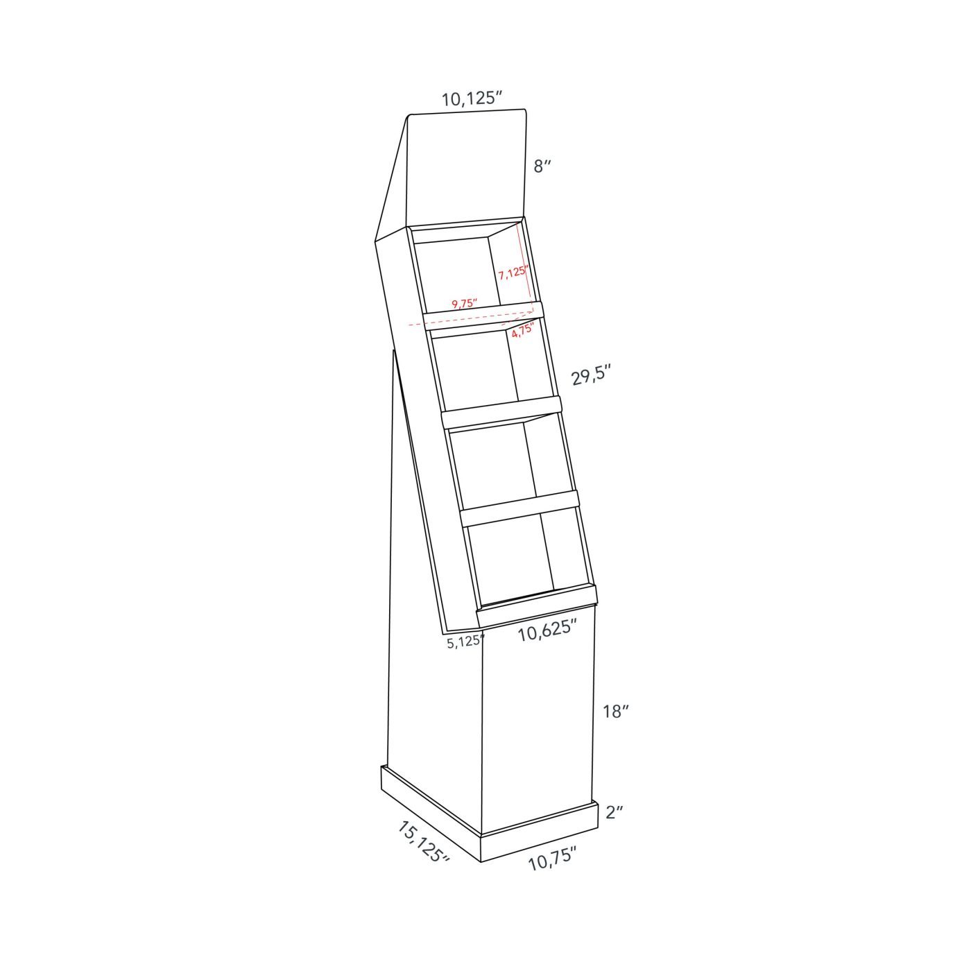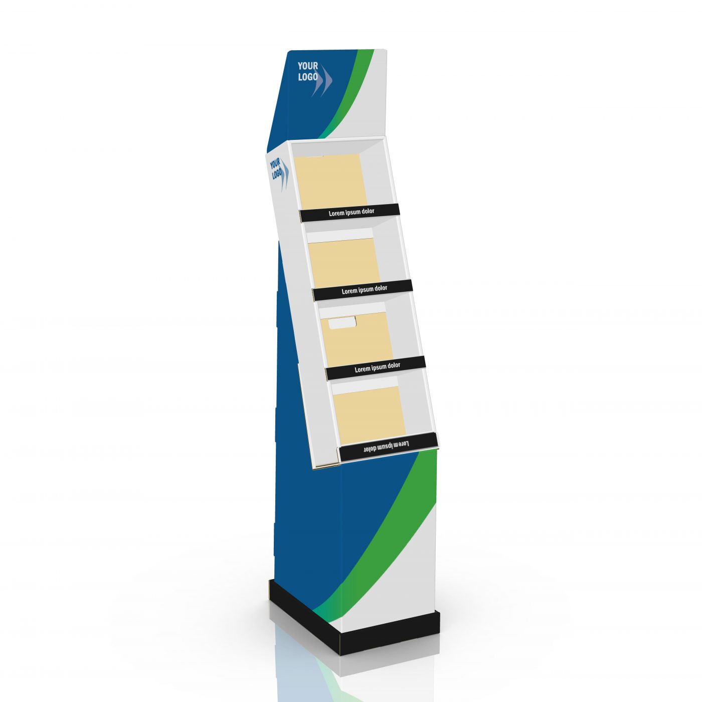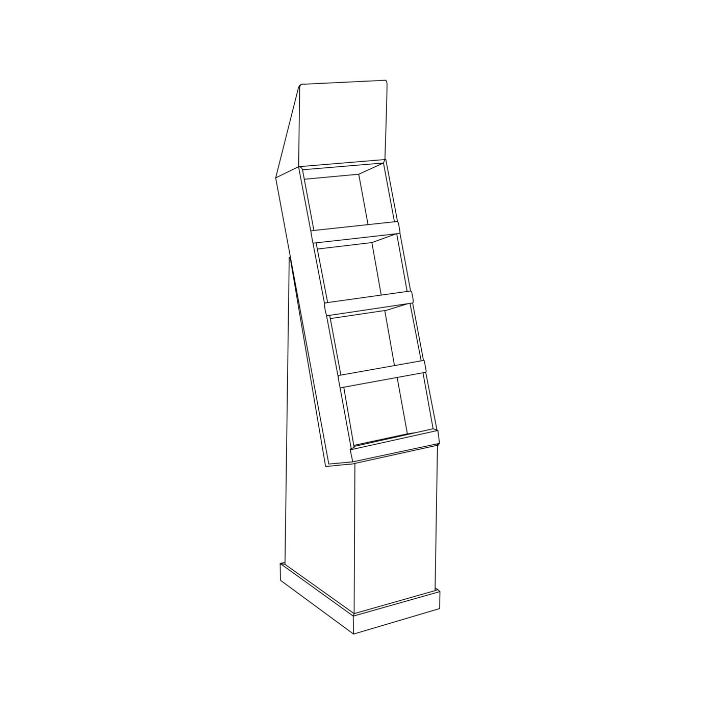 Présentoir de plancher en carton avec en-tête et 4 tablettes, déposé sur une base. Pour jeux, jouets, produits cosmétiques, produits naturels, accessoires de téléphones et plus.