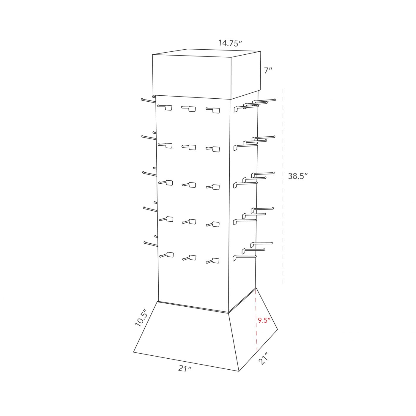 Présentoir de plancher carré en carton avec 60 crochets/pegs tout autour (15 de chaque côté) avec couvert et butoir. Pour jouets, petites voitures, sacs, accessoires et plus.