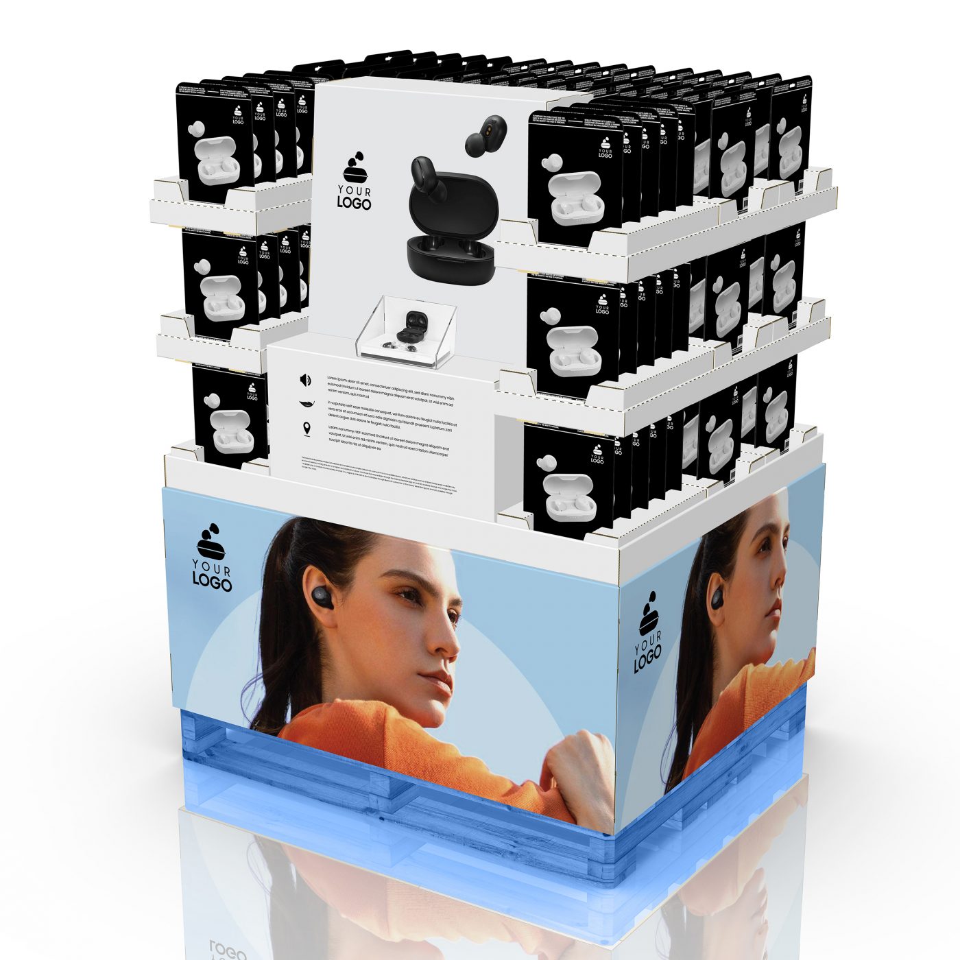 Palette multimédia avec en-tête et présentoirs pour cartes de bon. Un démonstrateur est placé au centre, protégé par une coquille de plastique faite sur mesure. Pour écouteurs, tablettes multimédia et plus.