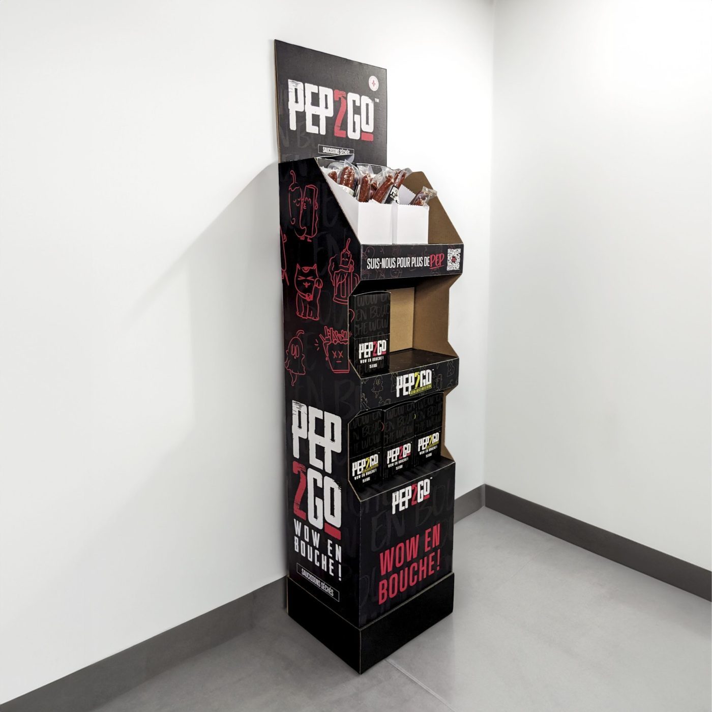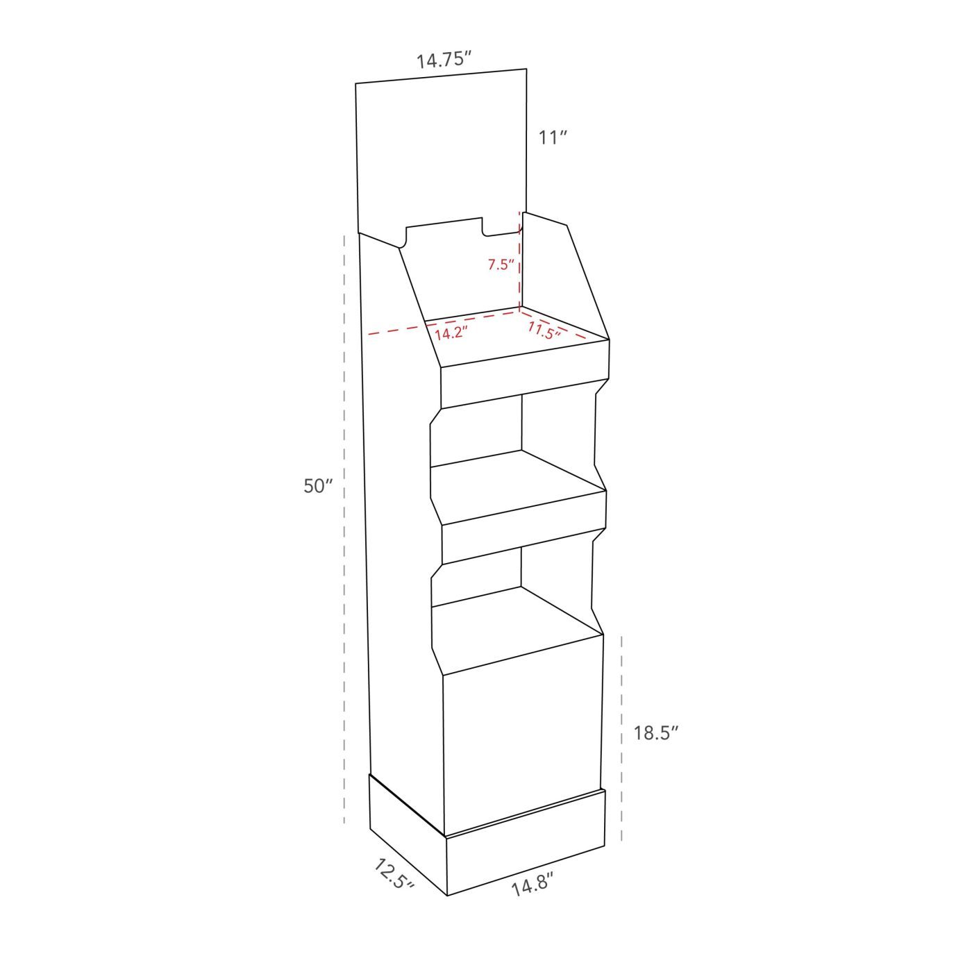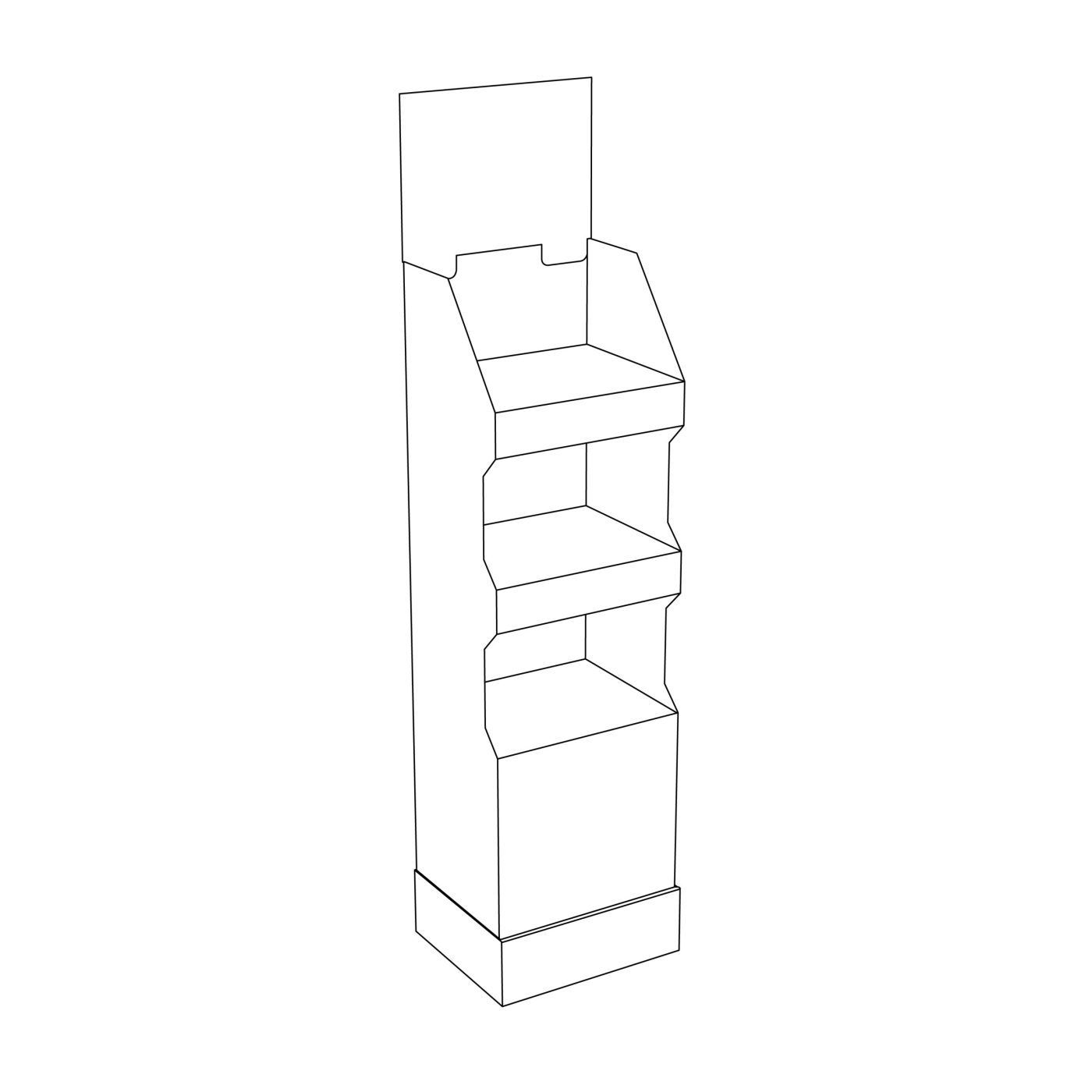 Présentoir de plancher en carton avec 3 tablettes et une en-tête, placé dans un butoir. Pour aliments, produits de beauté, vêtements et plus.