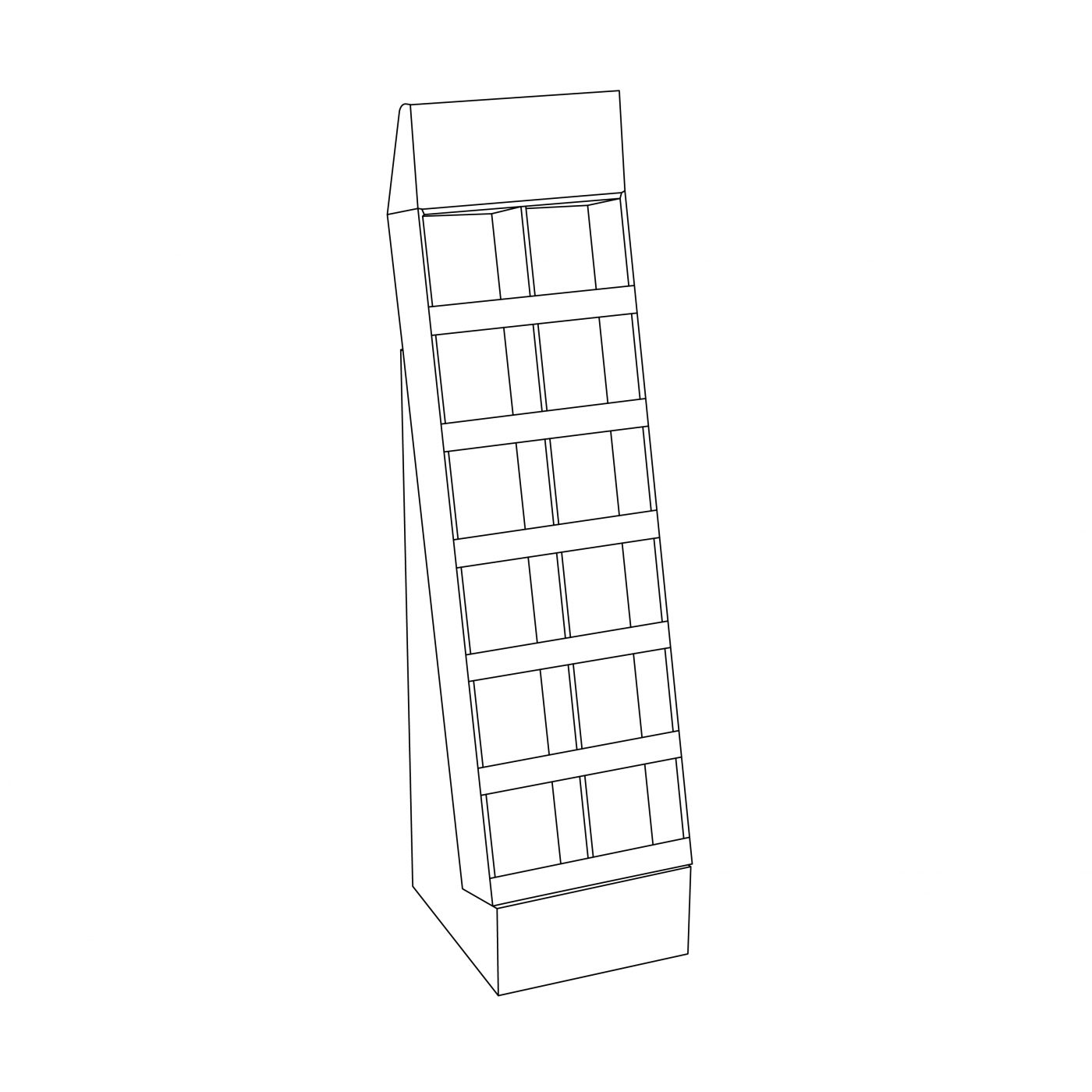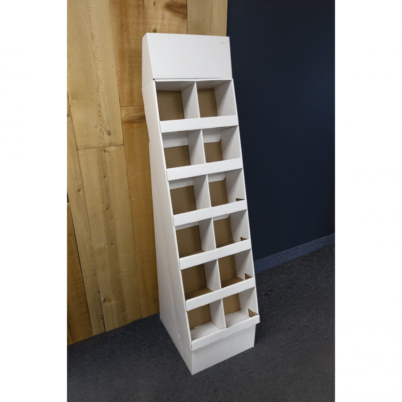 Présentoir de plancher en carton avec en-tête, 6 tablettes et 1 séparateur (12 cases), déposé sur une base. Pour pots d’épices, jouets, produits cosmétiques, aliments et plus.