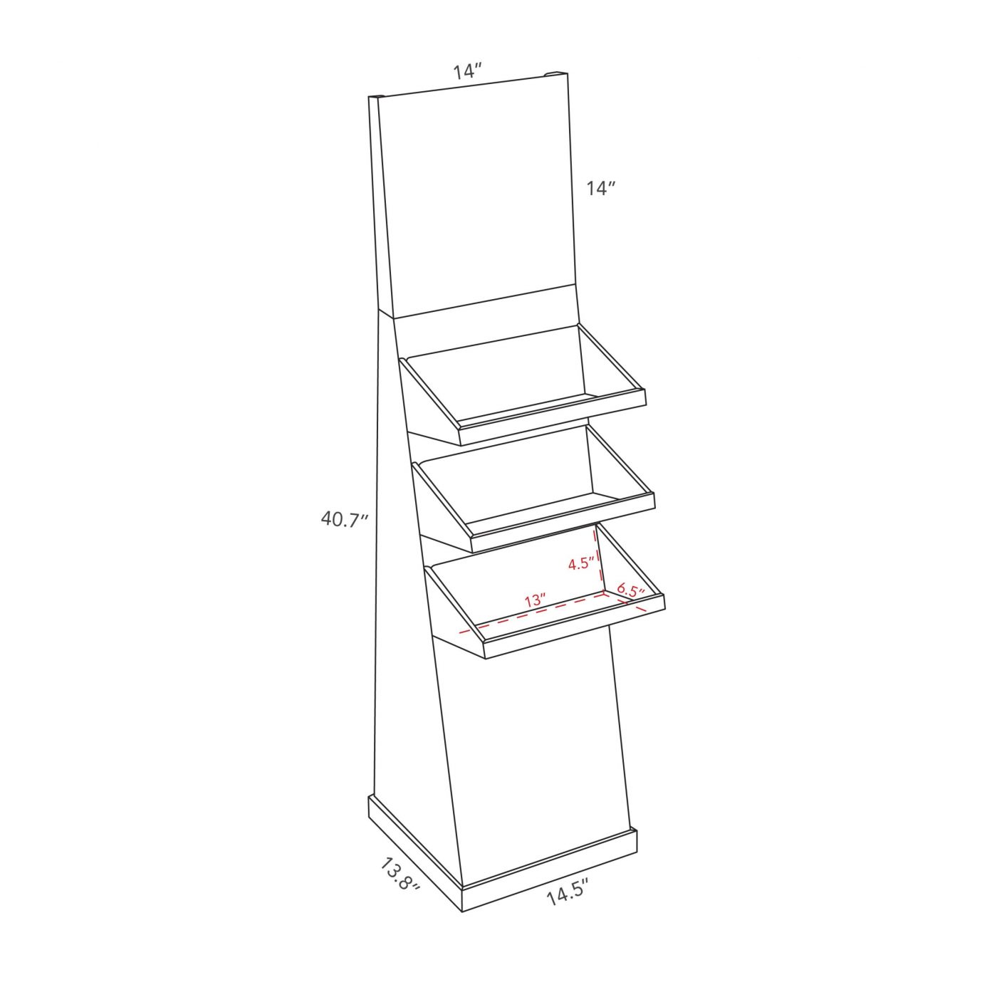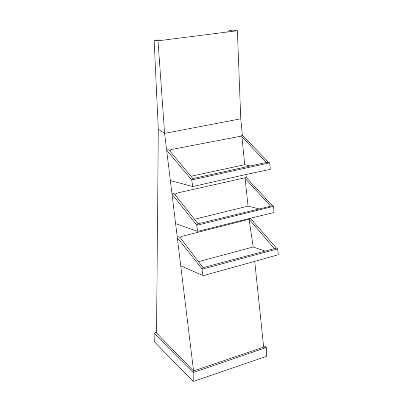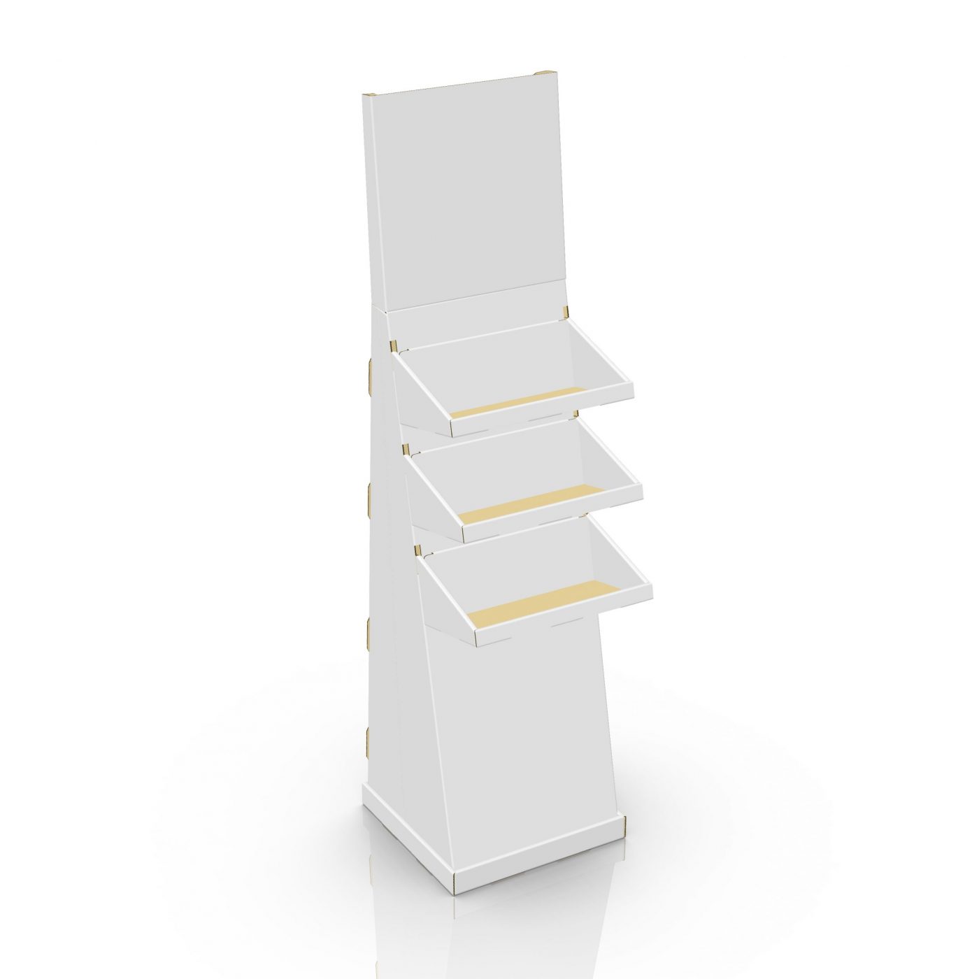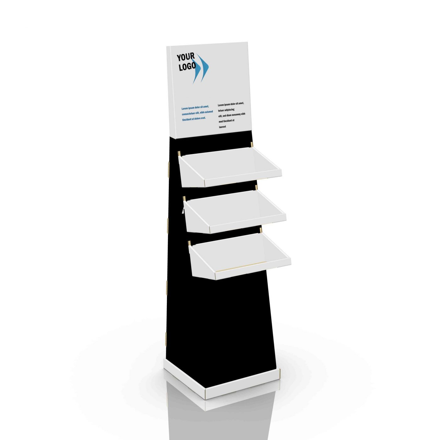 3 tier Cardboard floor display with 3 trays / 3 shelves and a header, placed on a kicker. For natural products, cosmetics and more.