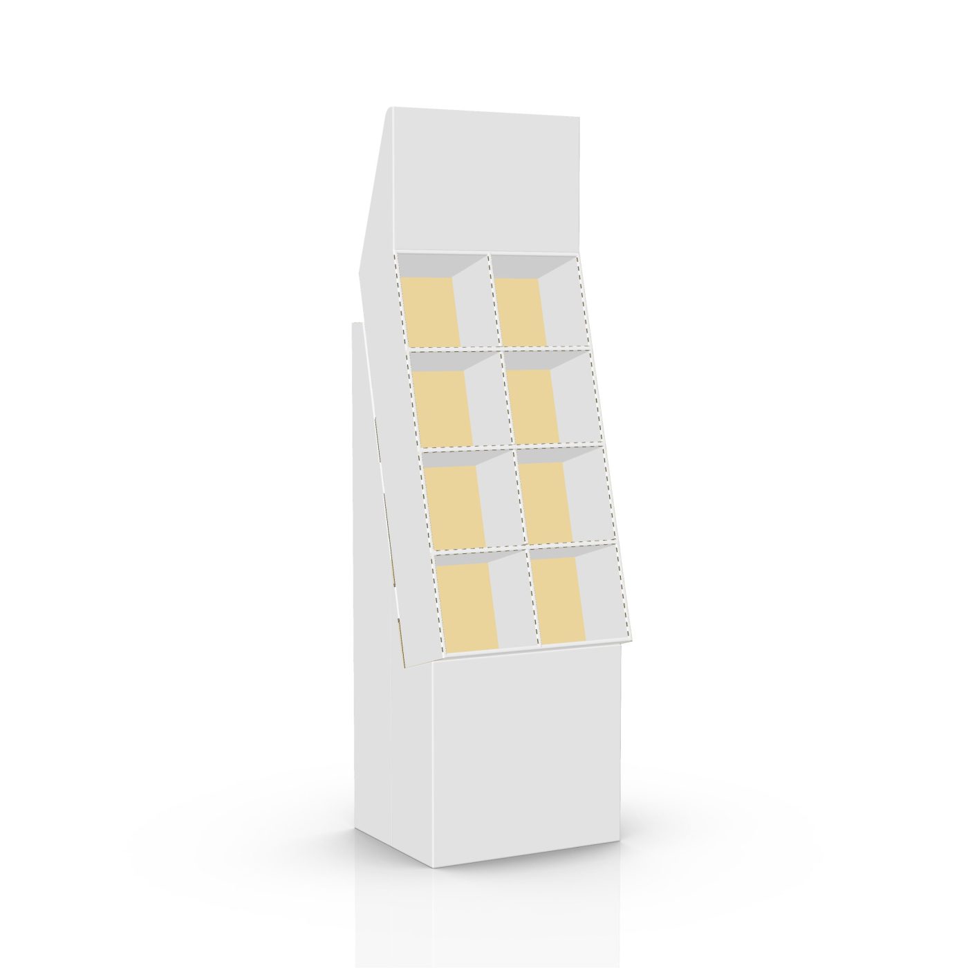 4 tier Angled Cardboard floor display with header and 4 shelves with a separator (8 slots), placed on a base. For food, phone accessories, toys, cosmetics and more.