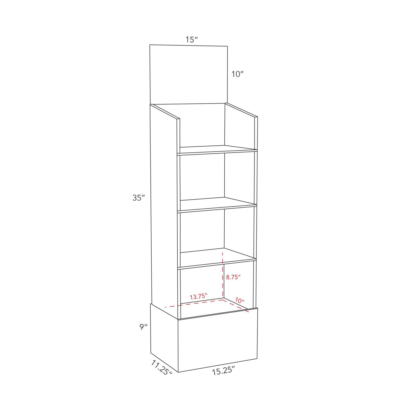 4 tier Cardboard floor display with 4 shelves, header and a blocker at the bottom. For light objects, toys, t-shirt, snacks and more.