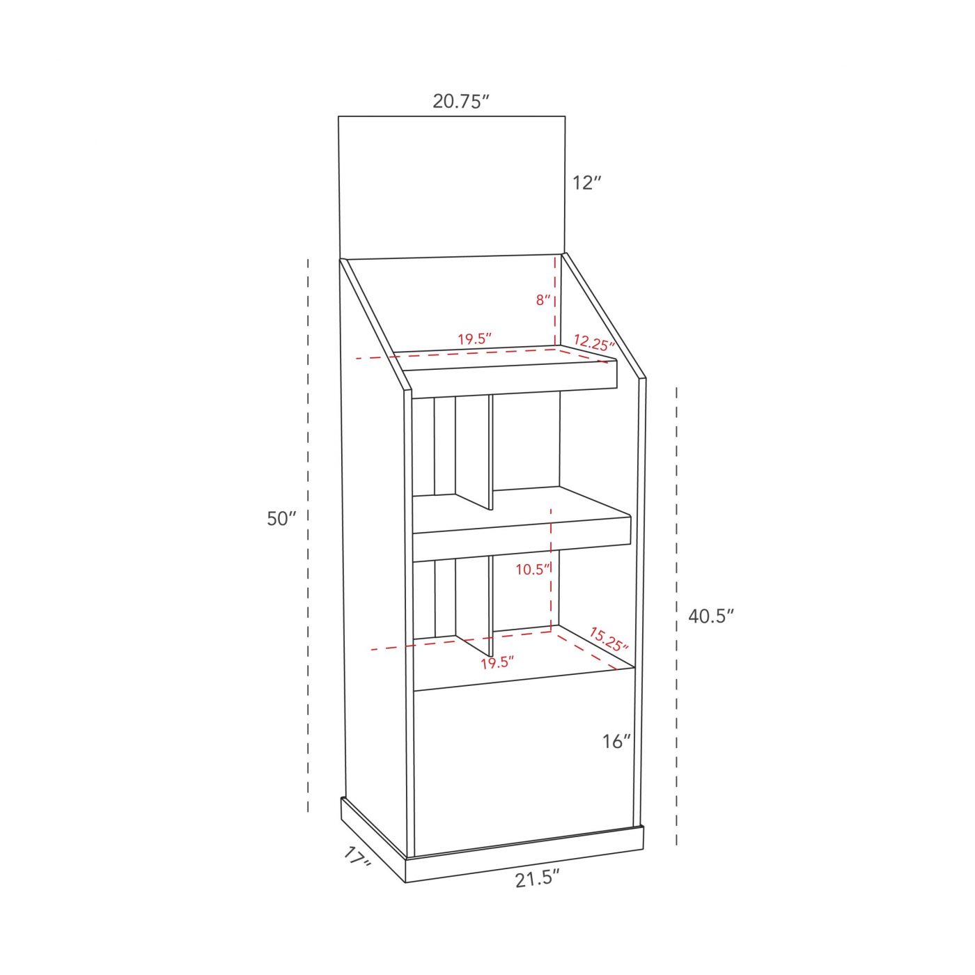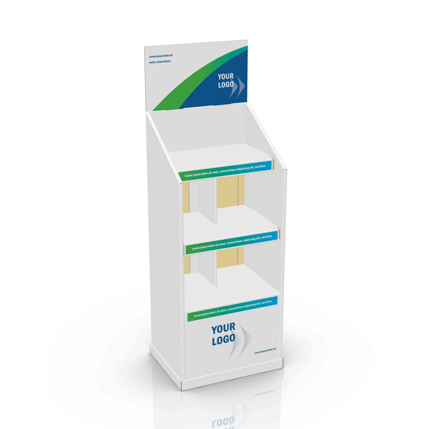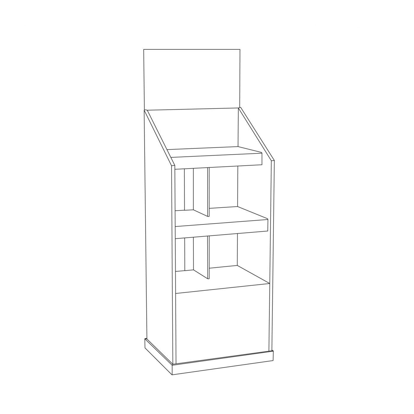 3 tier Custom Cardboard floor display with header and 3 shelves. Made to support bottles, cans and heavy products.