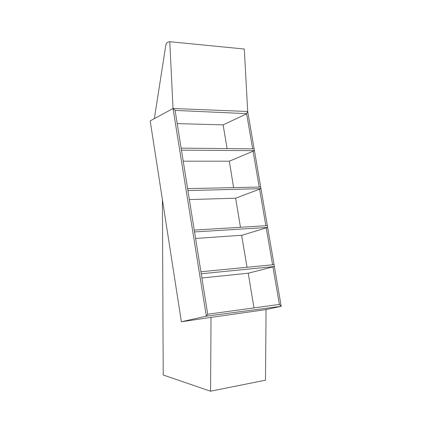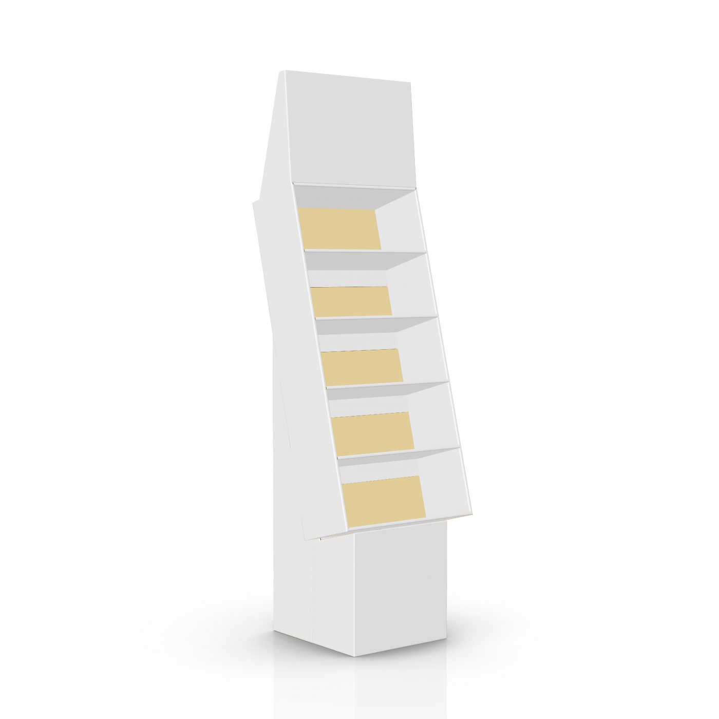 Présentoir de plancher en carton avec en-tête et 5 tablettes, déposé sur une base. Pour produits légers, peluches, jouets, étuis pour cellulaire et plus.