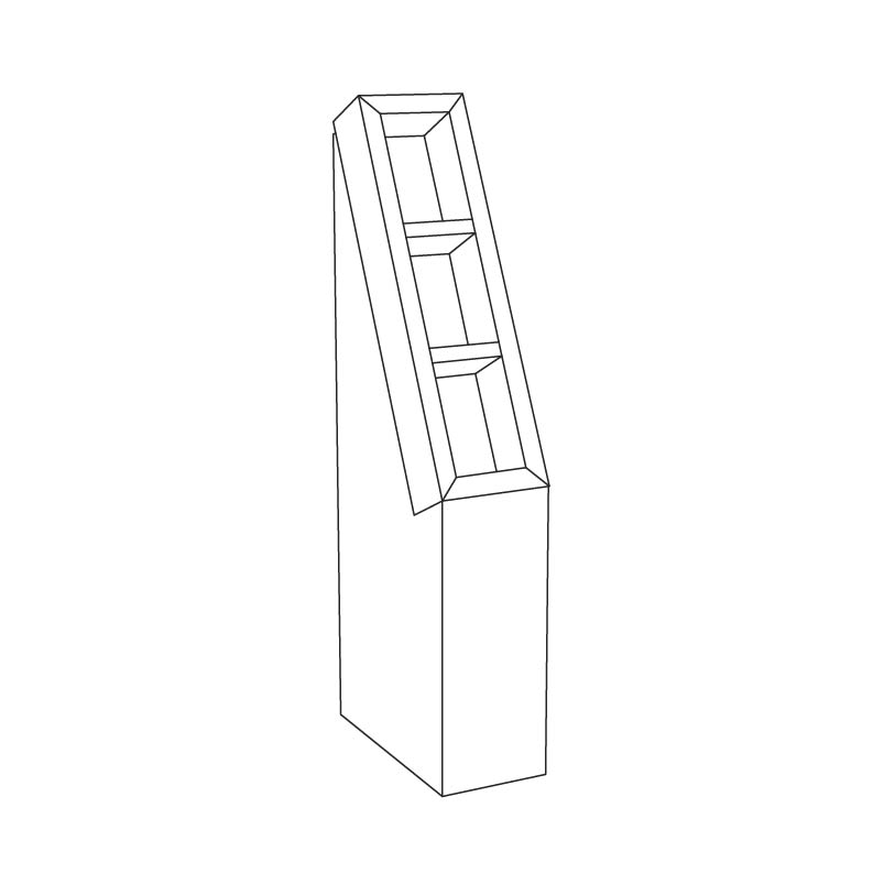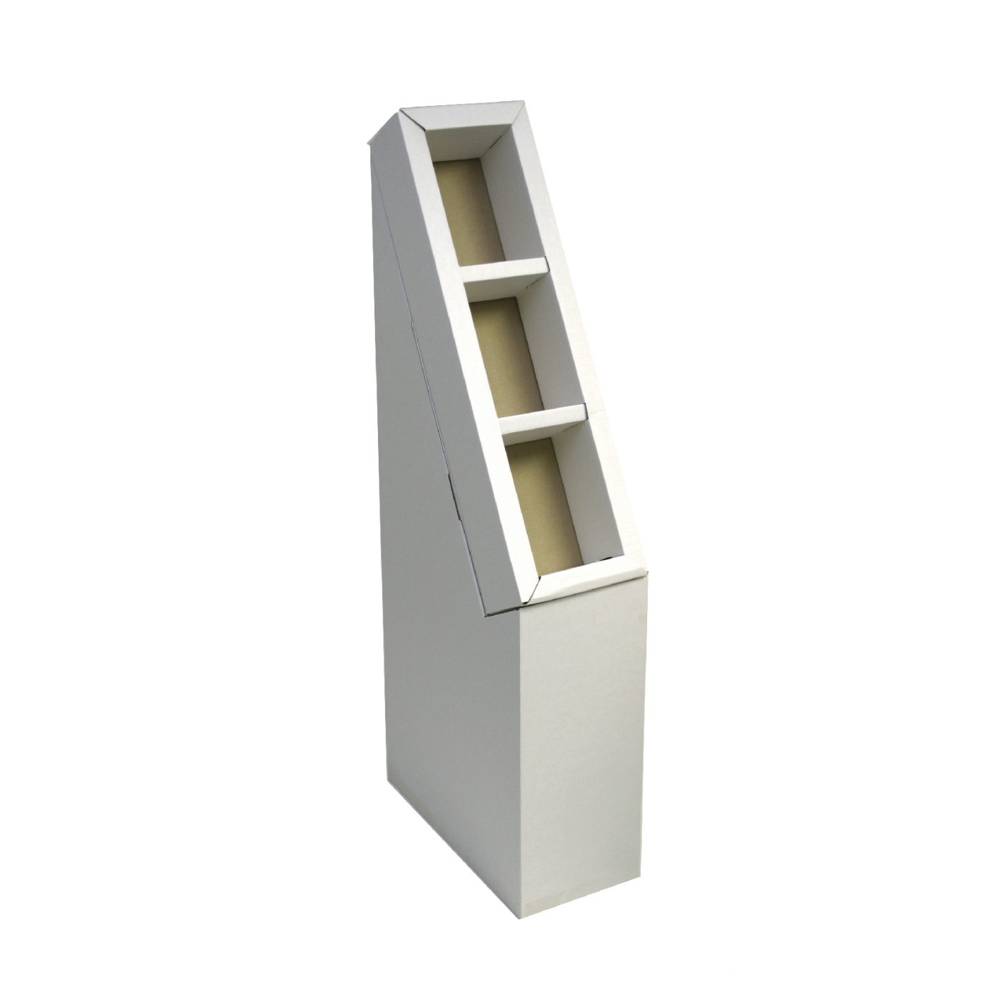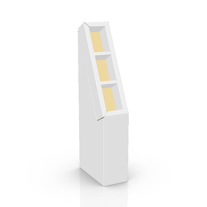 3 tier Cardboard floor display with 3 shelves, placed on a base. Made of corrugated cardboard. For light objects such as cosmetics, toys, plushes, snacks, and more.