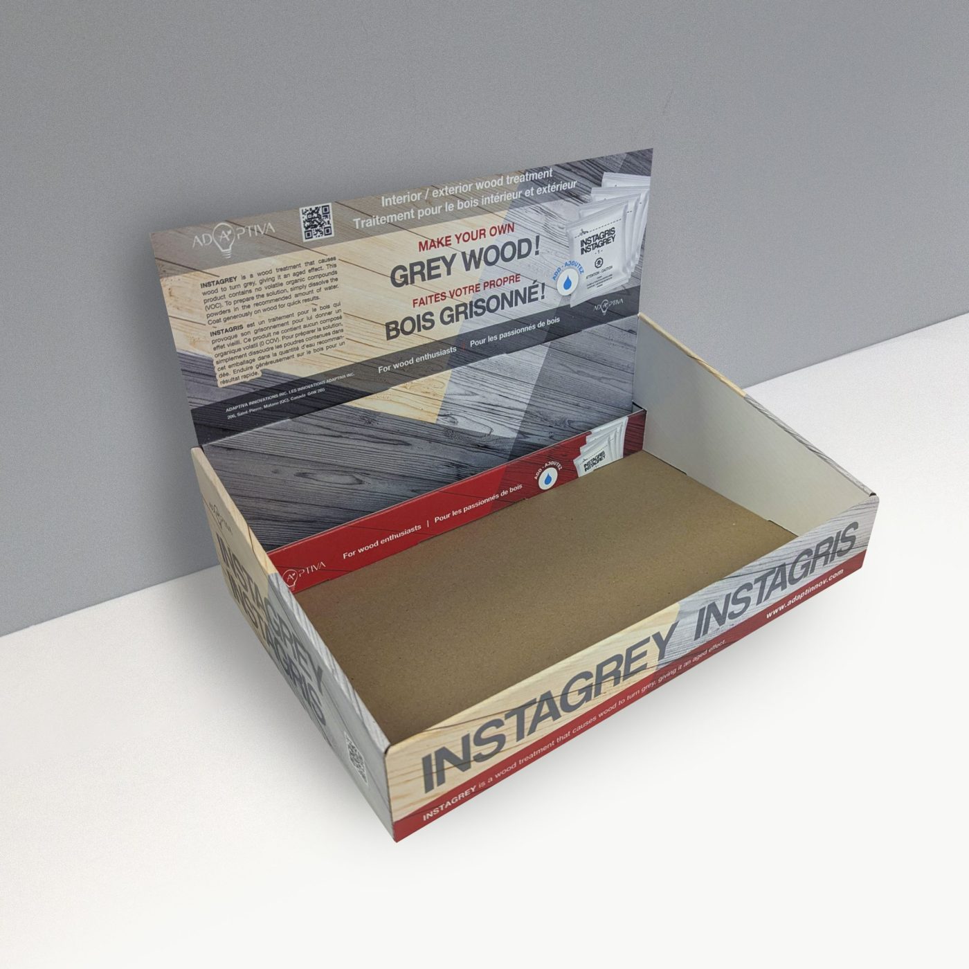 Cardboard counter display 100% local, with header and slot on the back for pamphlets. For retail stores, department stores and more. For cards, games, cosmetics, accessories, tools, paint and more.