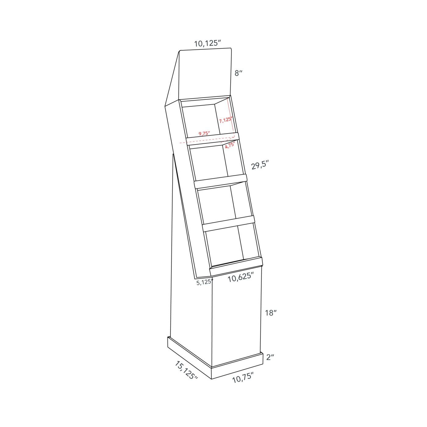 4 tier Angled Cardboard floor display with a header and 4 shelves, placed on a base. For games, toys, cosmetics, natural products, phone accessories and more.