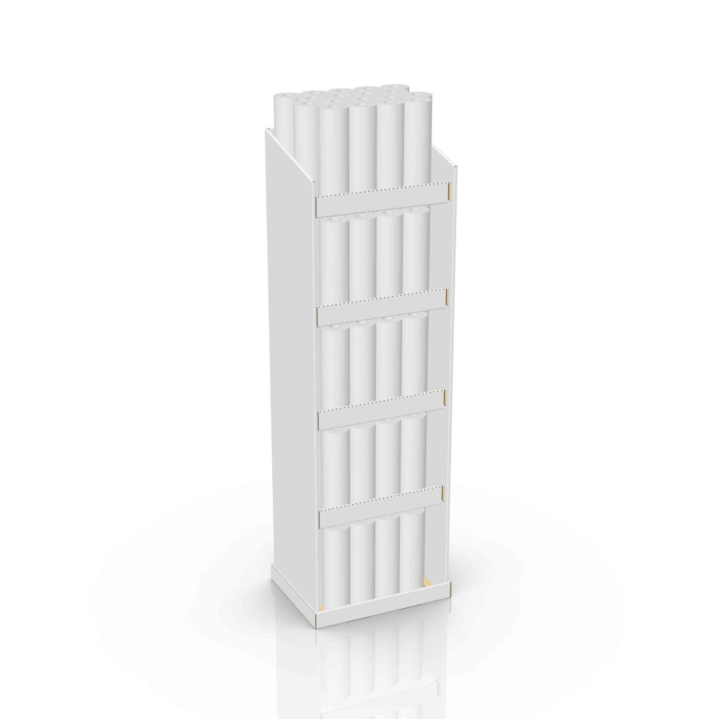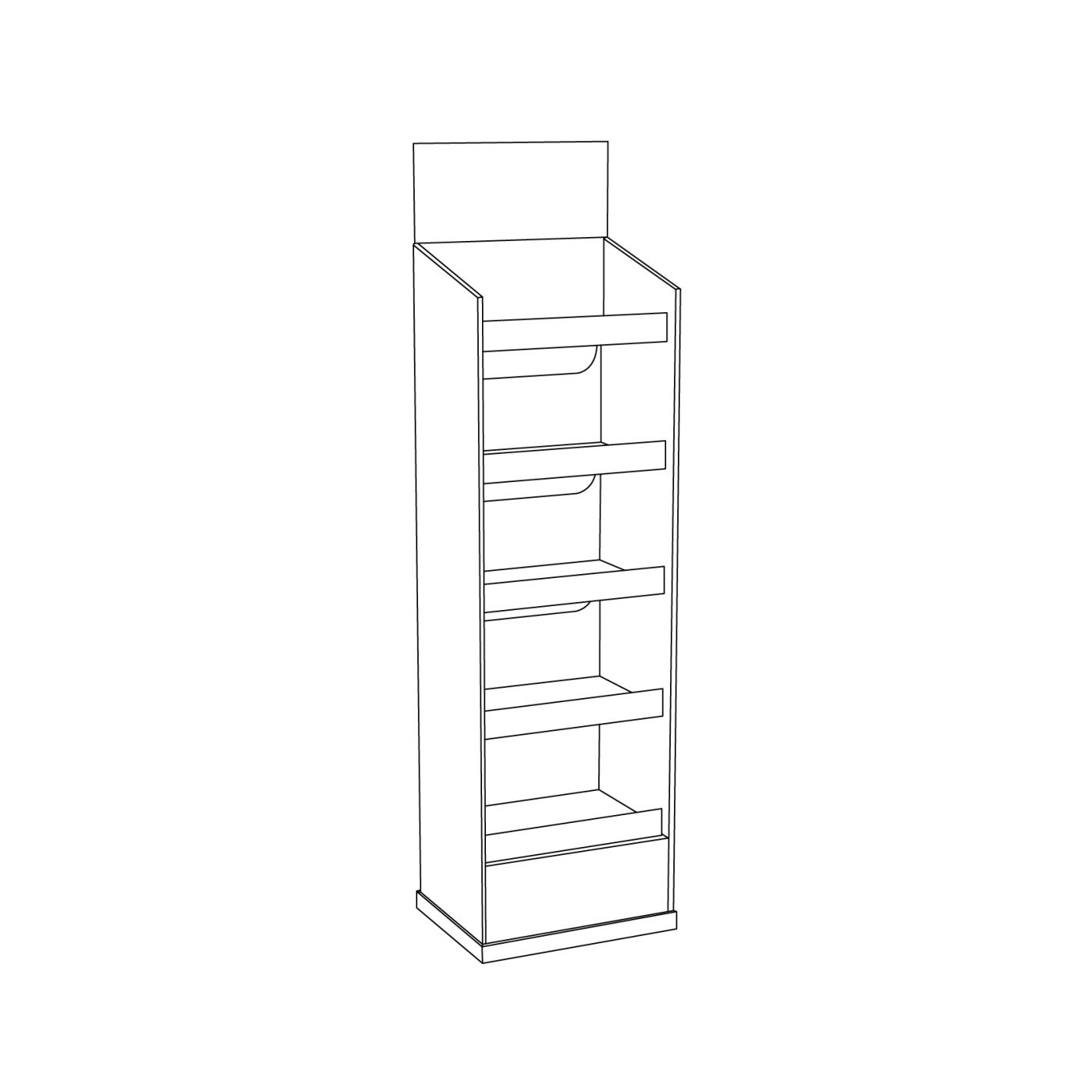 5 tier Cardboard floor display with a header and 5 shelves, placed in kicker. For clothing, boardgames, toys, decorations, plants and more.